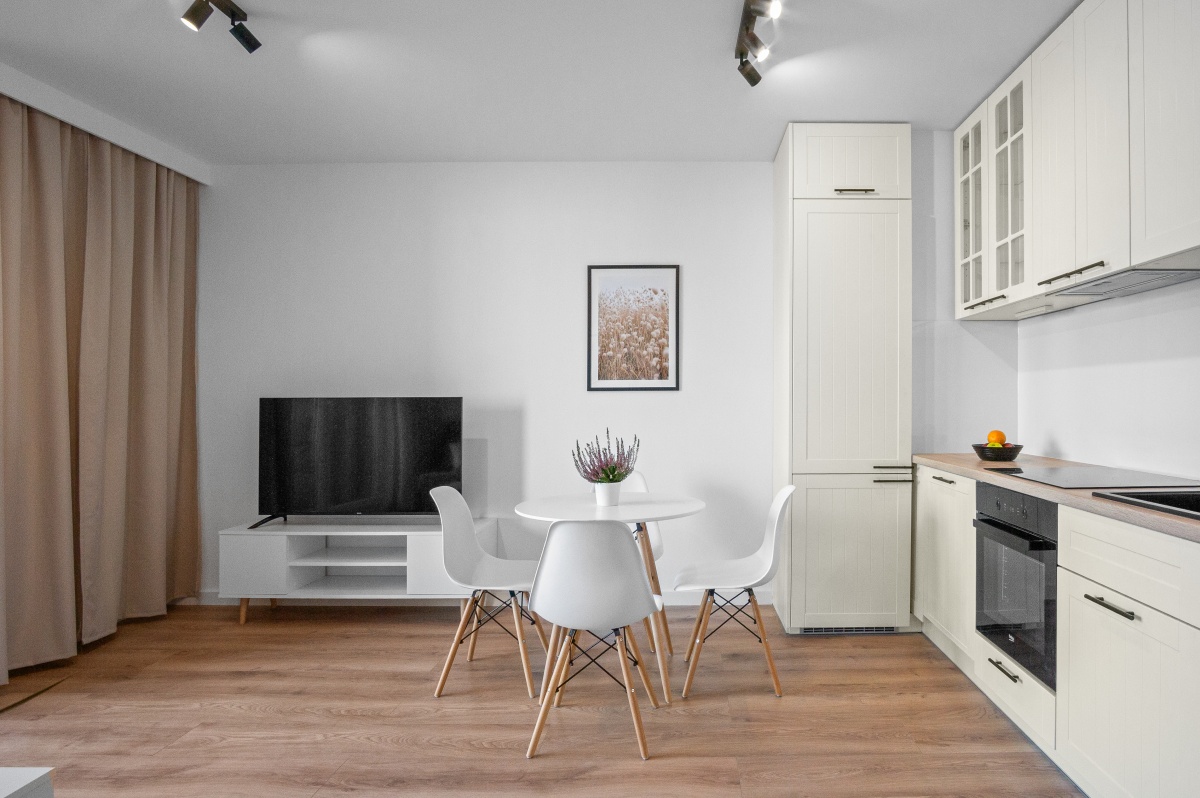 salon z aneksem kuchennym wyposażonym w płytę indukcyjną, piekarnik, zmywarkę i okap