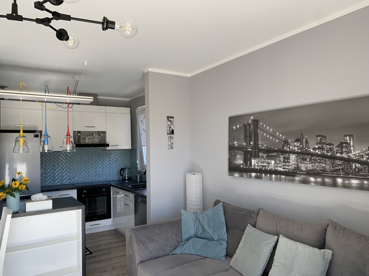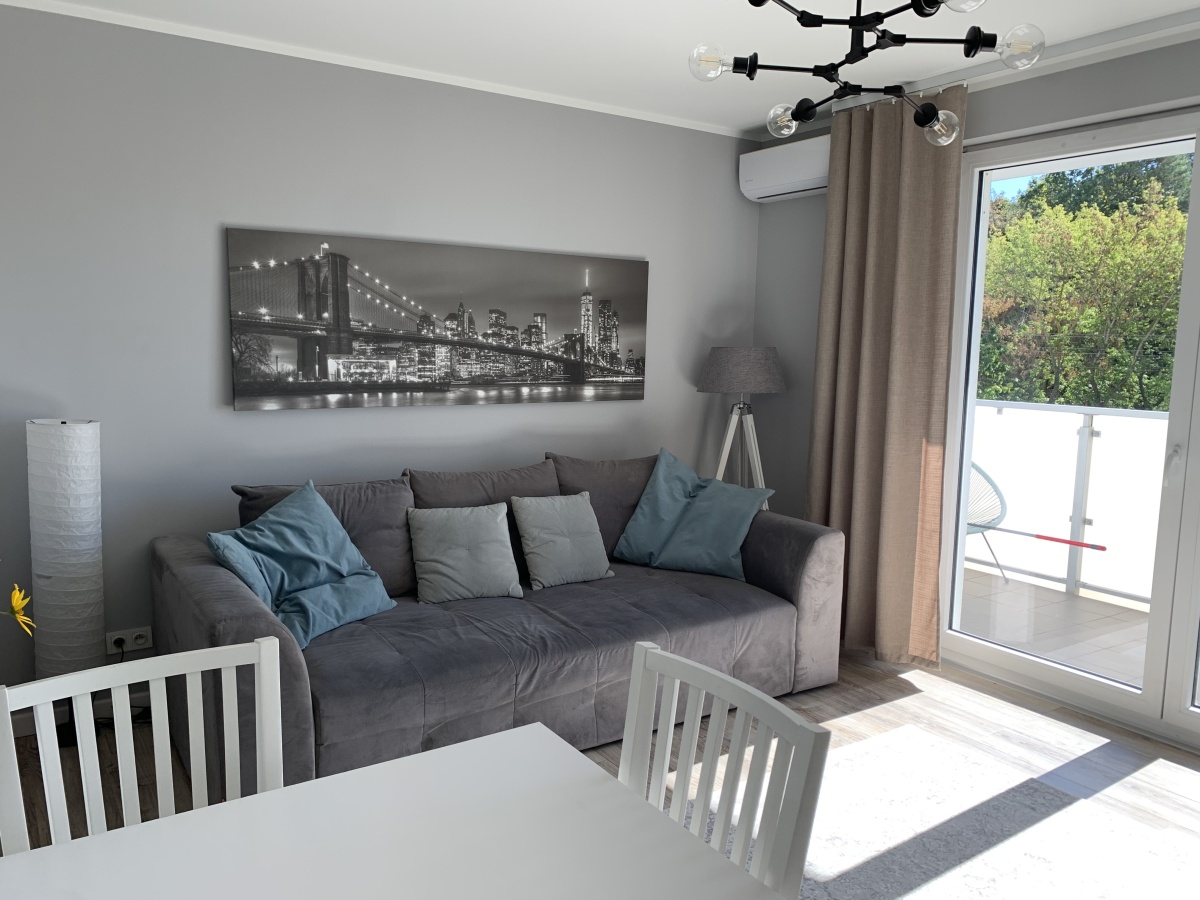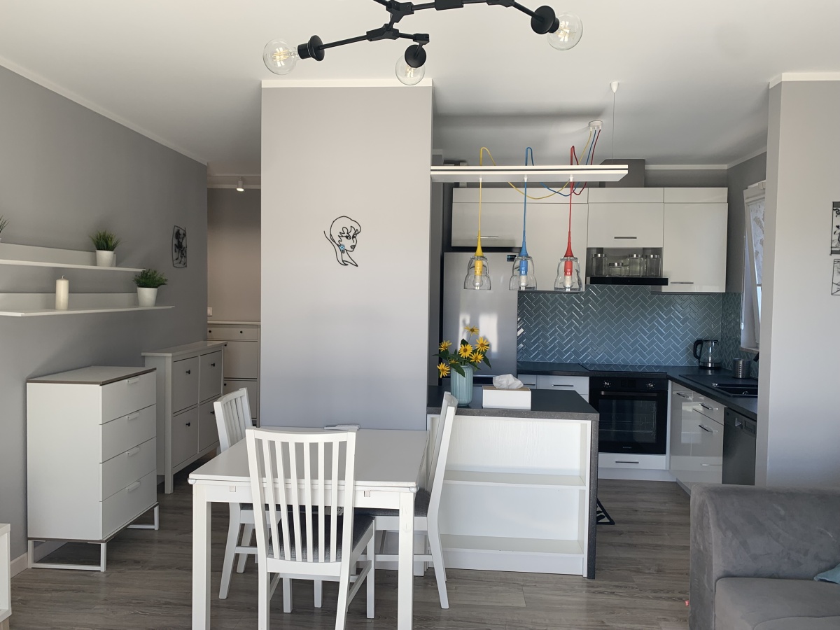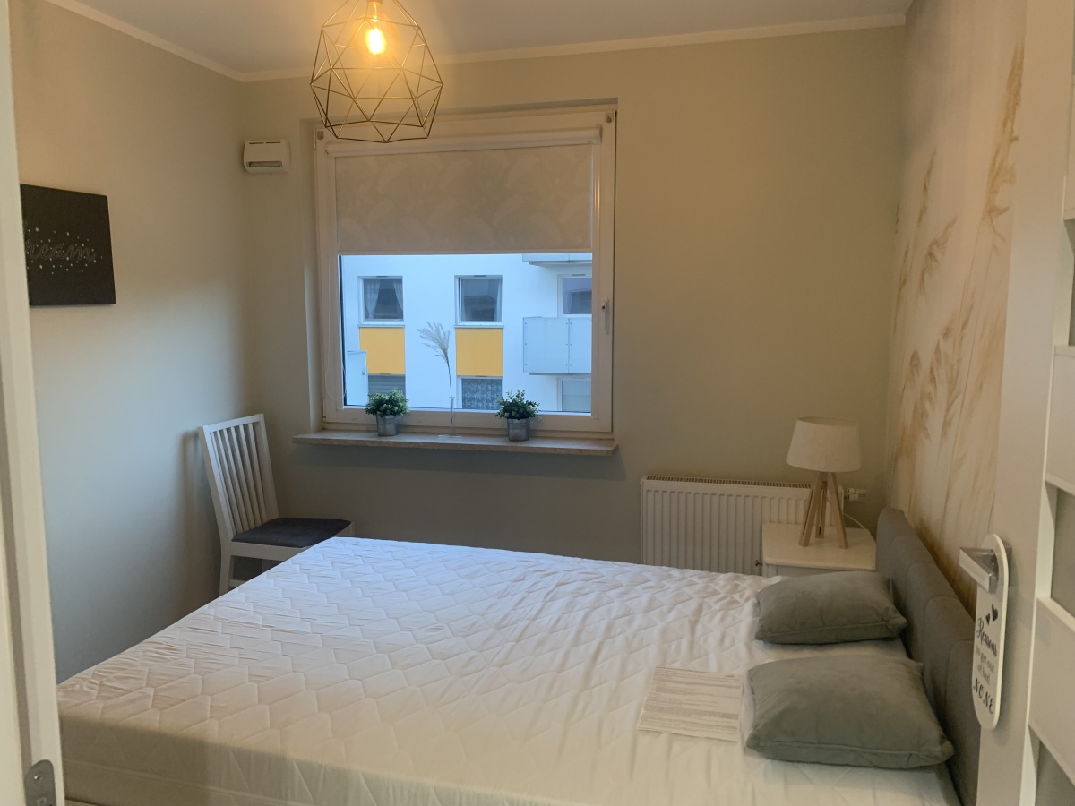Mieszkanie składa się z jasnego pokoju dziennego (salon), aneksu kuchennego, sypialni, łazienki i balkonu. Wszystkie pomieszczenia są świeżo po remoncie. Całość klimatyzowana jest indywidualną jednostką.