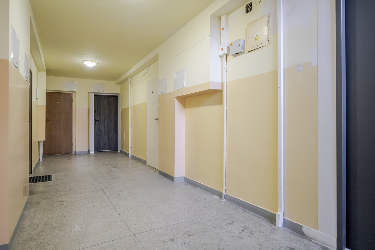 Квартира розташована на 3-му поверсі відремонтованого 4-поверхового будинку та має південну орієнтацію з видом на дерева та панораму східного Гданська.