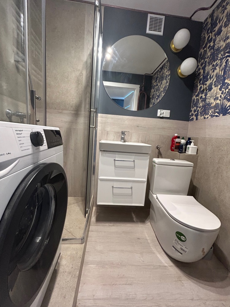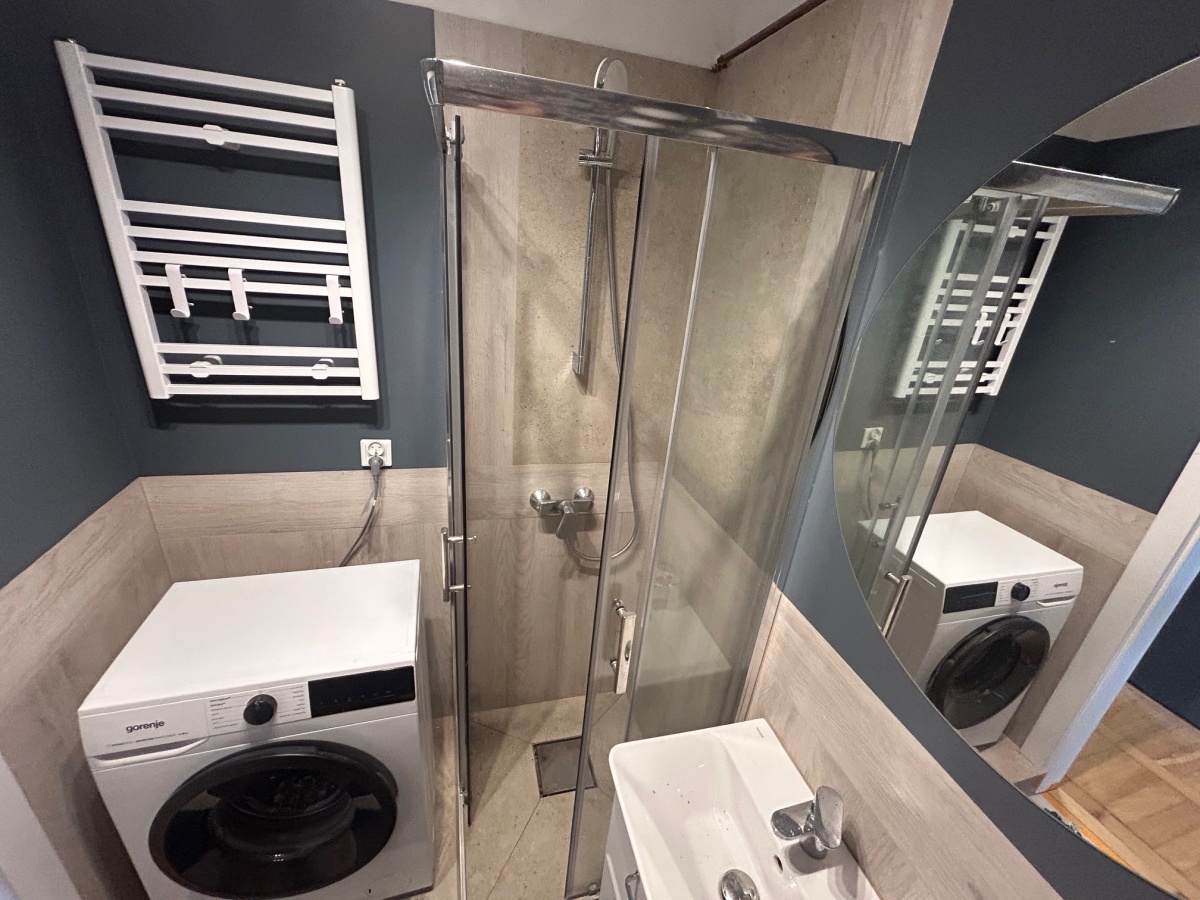 Łazienka – z kabiną prysznicową oraz pralką.