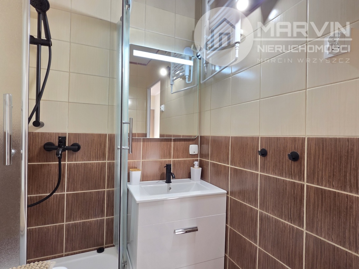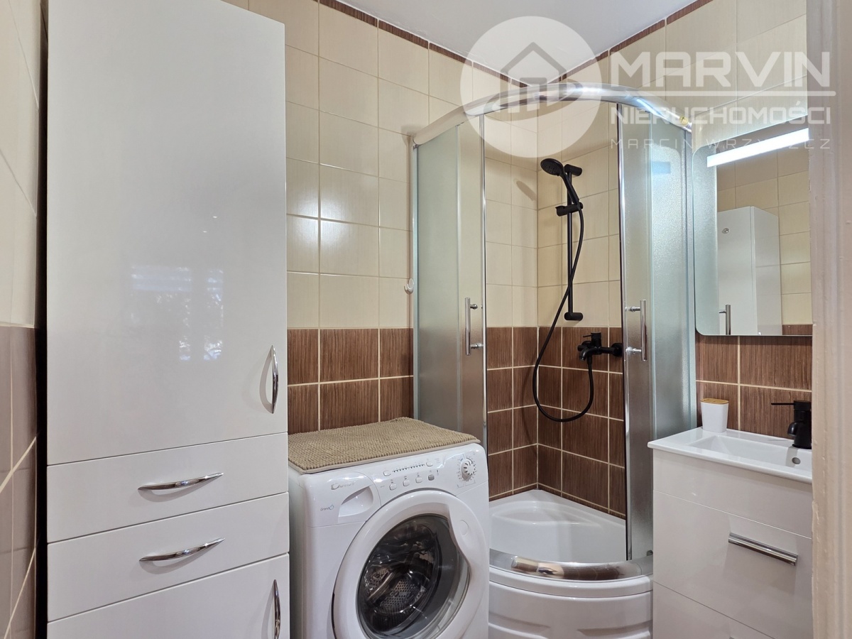 Łazienka – kabina prysznicowa, pralka, umywalka z szufladami, lustro, szafa.