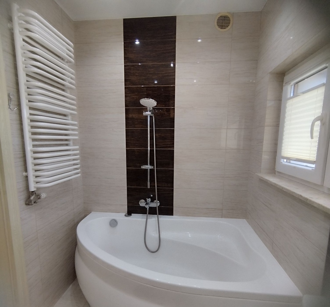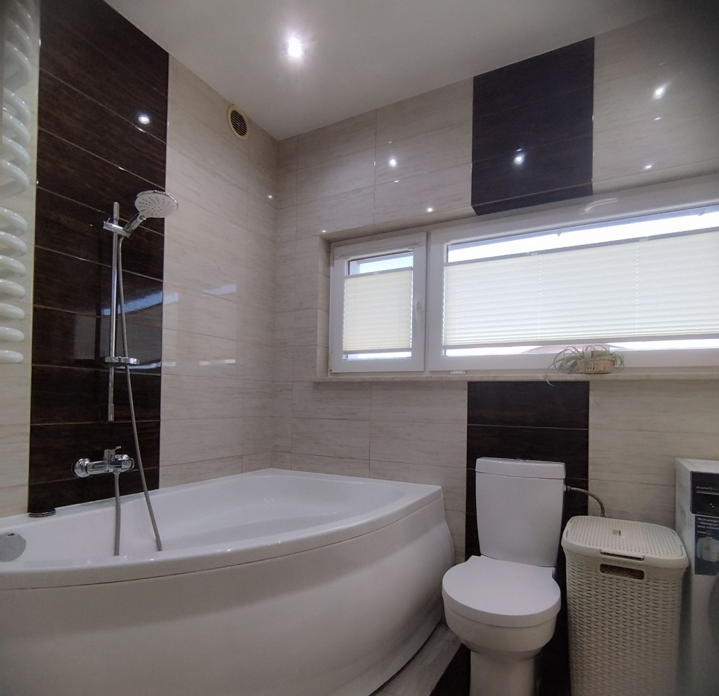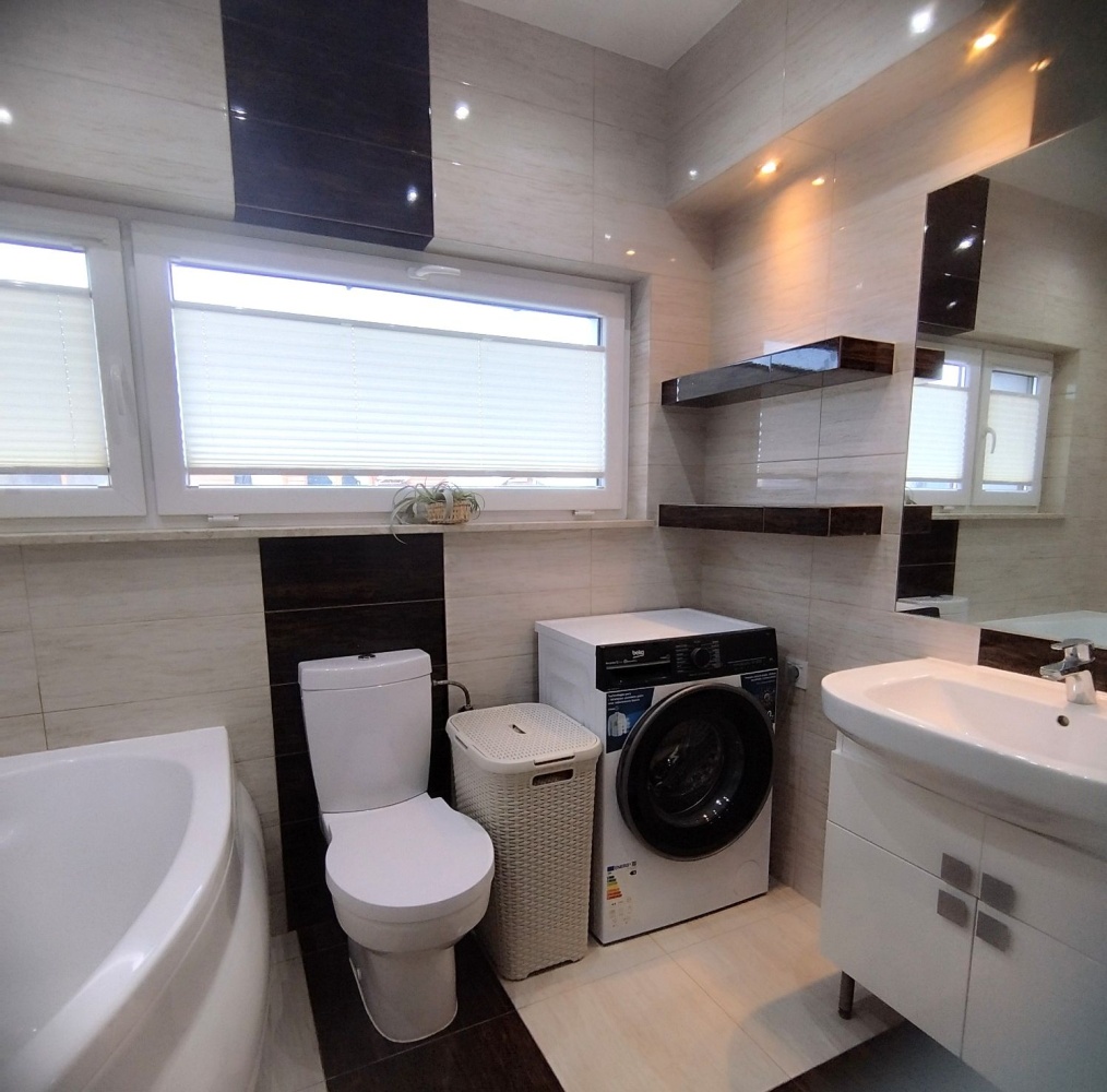 • Łazienka: Łazienka wyposażona w dużą wannę, WC, umywalkę z szafką, duże lustro oraz pralkę. Okno od strony północnej zapewnia naturalne doświetlenie.
