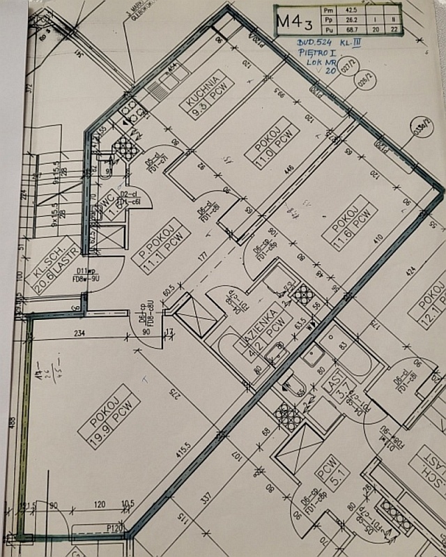 – 3 oddzielne pokoje z możliwością wydzielenia 4 pokoju (19,9m2; 11m2, 11,6m2)