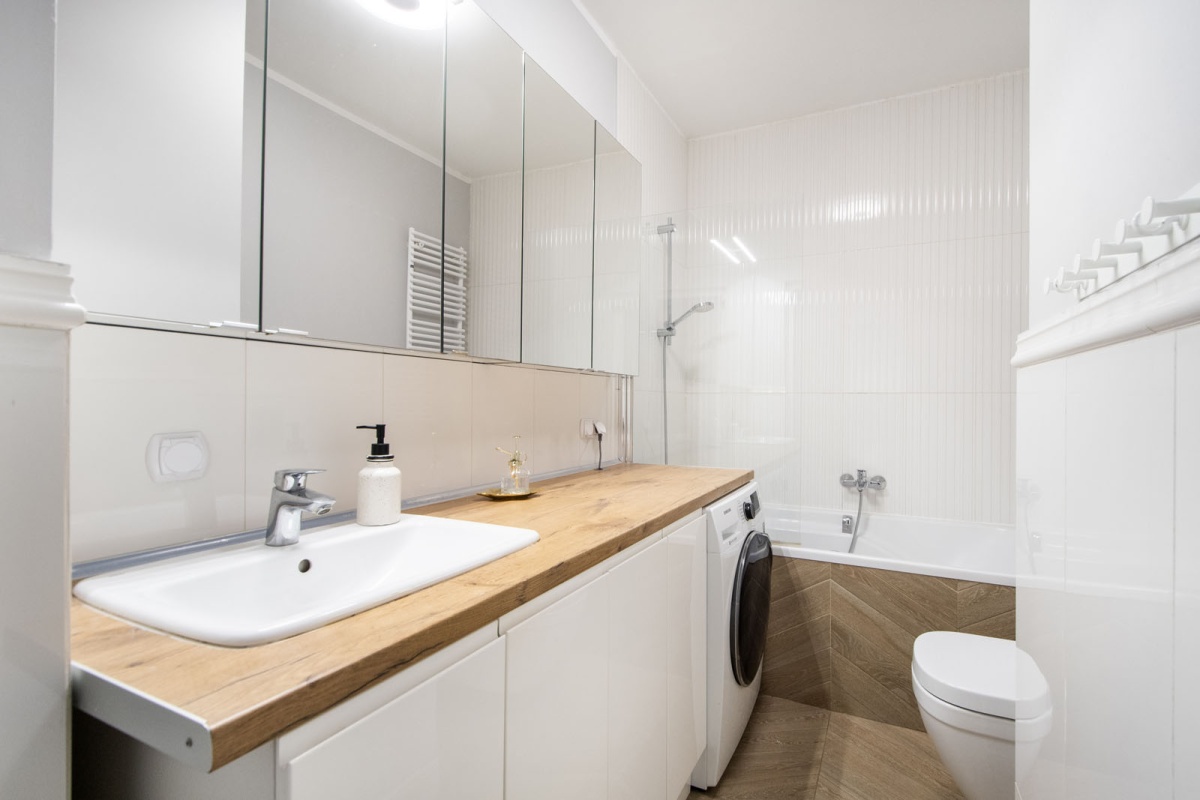 – Łazienki wyposażonej w dużą wannę, pralko-suszarkę;