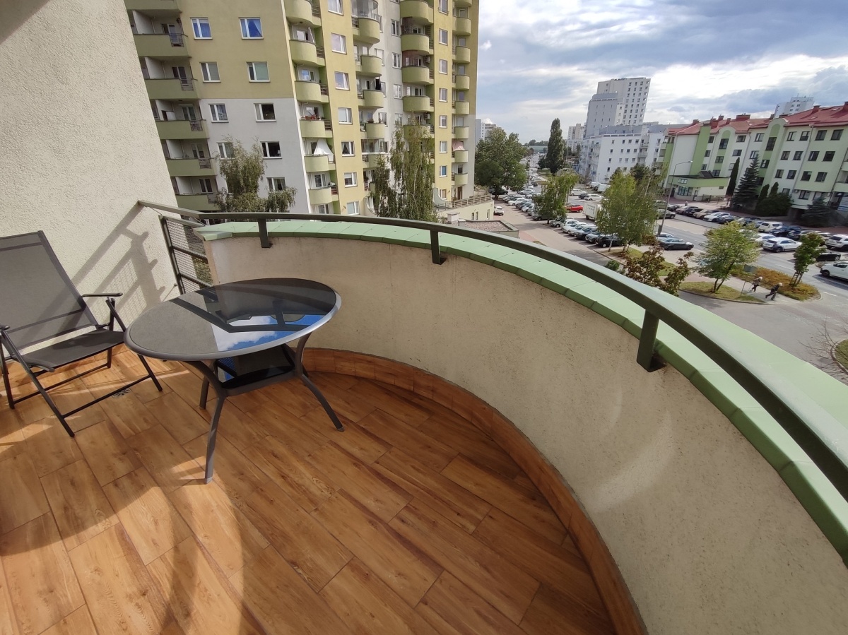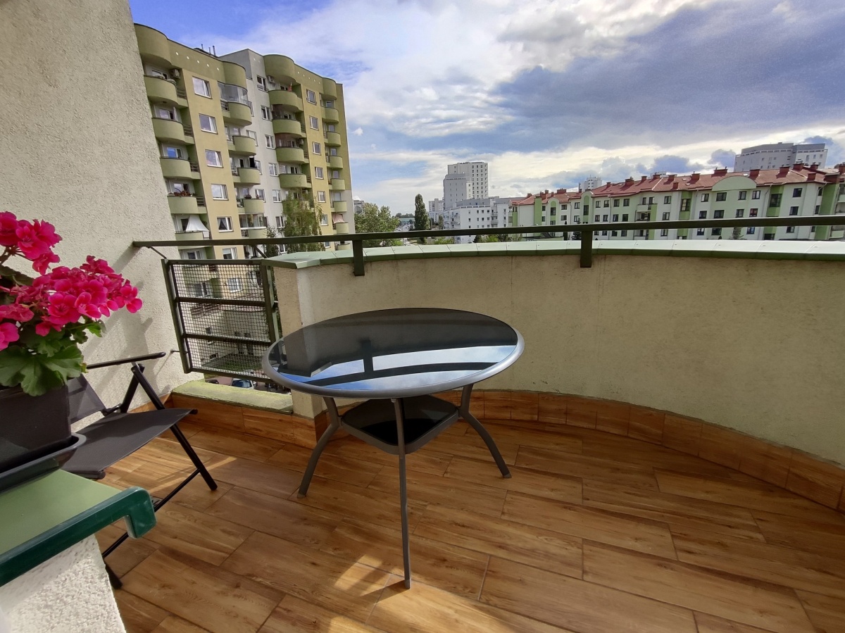 salon z wyjściem na przestronny, ładnie zagospodarowany balkon, przestronna sypialnia, elegancka i doskonale wyposażona kuchnia,