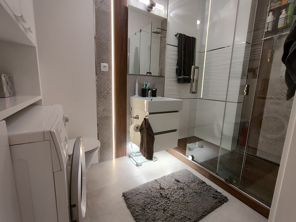 łazienka z prysznicem i miejscem na pralkę, przedpokój z zabudowanymi szafami wnękowymi.