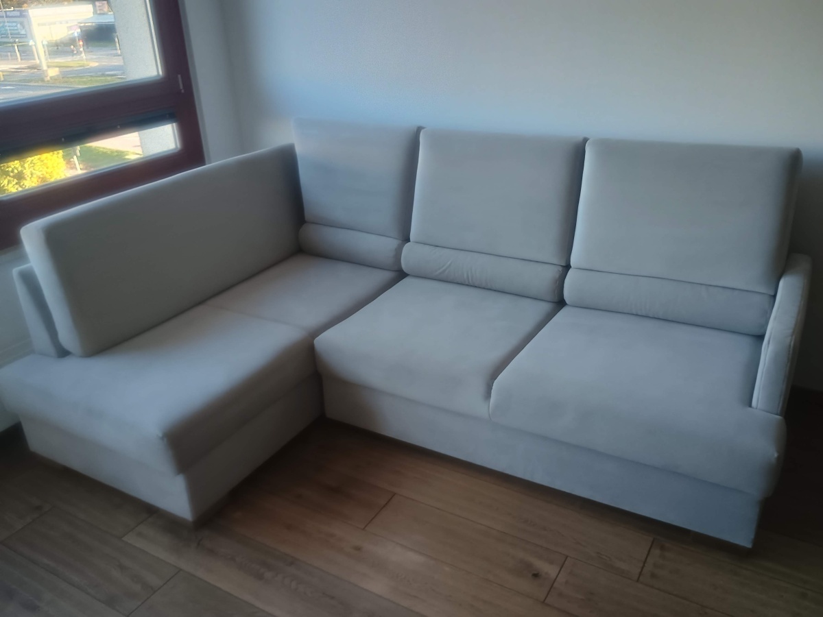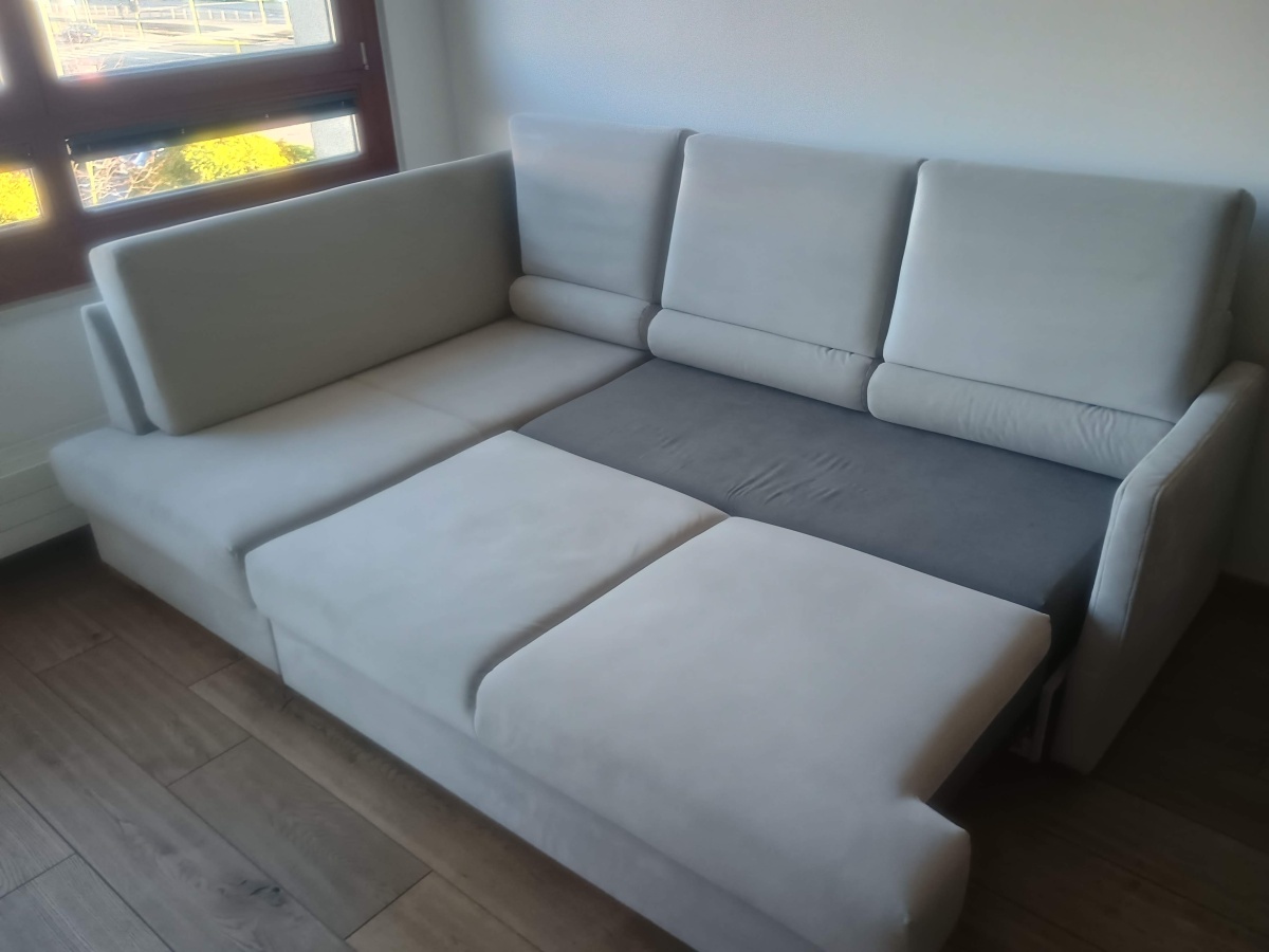 – salon: narożnik z funkcją spania całorocznego, szafa na ubrania i inne rzeczy oraz TV, stół, krzesła.