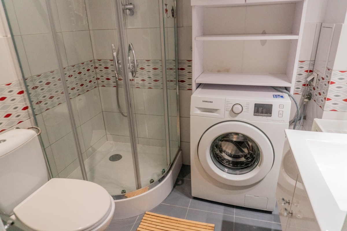 Łazienka o pow. 3 m2 To dobrze rozplanowana przestrzeń, w której znajdują się : prysznic, umywalka, pralka, WC oraz szafki na kosmetyki.
