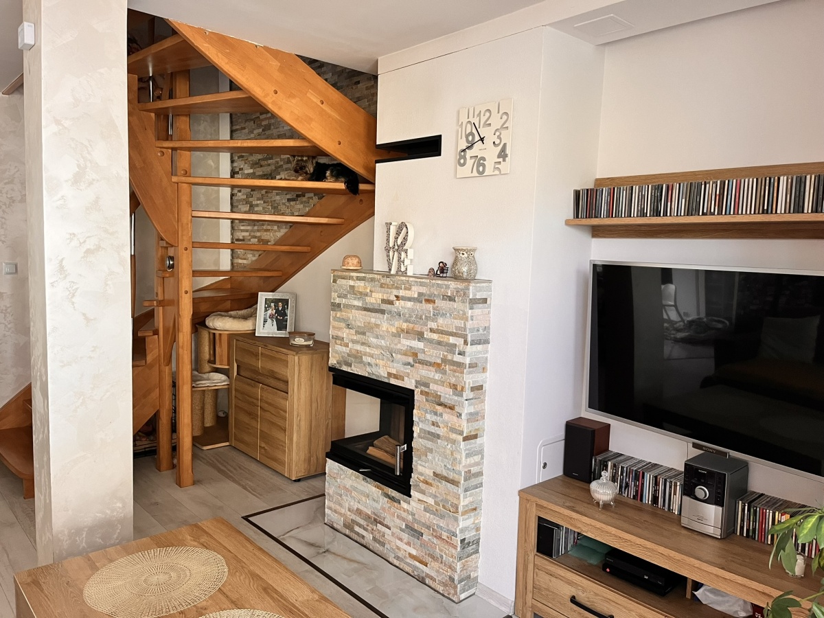 Na parterze znajduje się przestronny salon z kominkiem, połączony z nowoczesną kuchnią. Znajduje się tu też niewielki przedpokój oraz toaleta i pomieszczenie gospodarcze, które dodatkowo zaadoptowano na pralnie. Na piętrze trzy sypialnie w tym jedna z wydzieloną garderobą oraz jedna z zabudowanymi szafkami w skosie. Podwieszane sufity z dodatkowym oświetleniem LED w pokojach, salonie, łazience, toalecie oraz w przedpokoju. Dodatkowo ogromnym atutem jest ogród zimowy który tworzy niepowtarzalny klimat zarówno zimą jak i latem. Istnieje możliwość zaadoptowania tego pomieszczenia na dodatkową sypialnię bez dodatkowych pozwoleń i ingerencji w strukturę budynku. Poddasze(strych)nieużytkowe, ocieplone i wykończone płytami OSB(służy jako dodatkowa przestrzeń magazynowa).