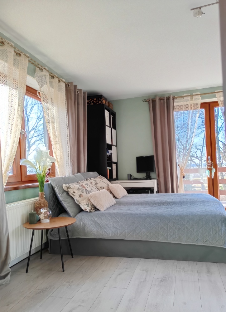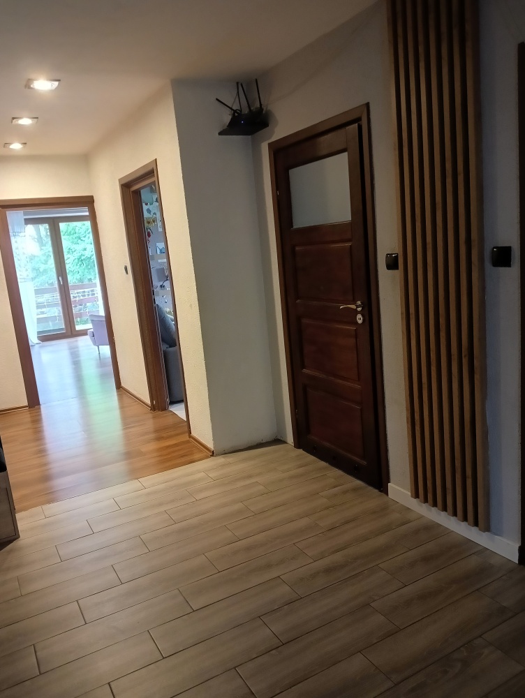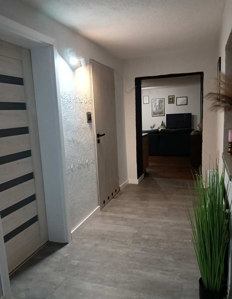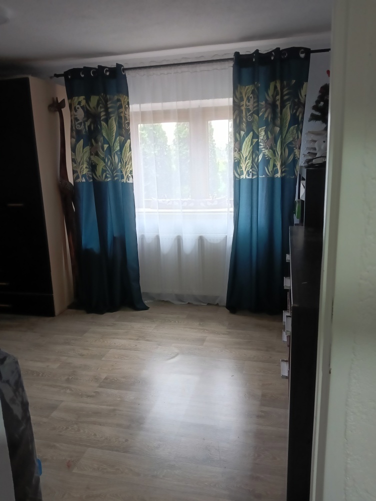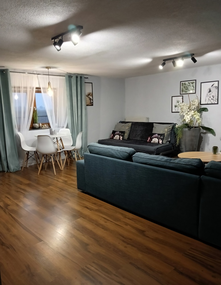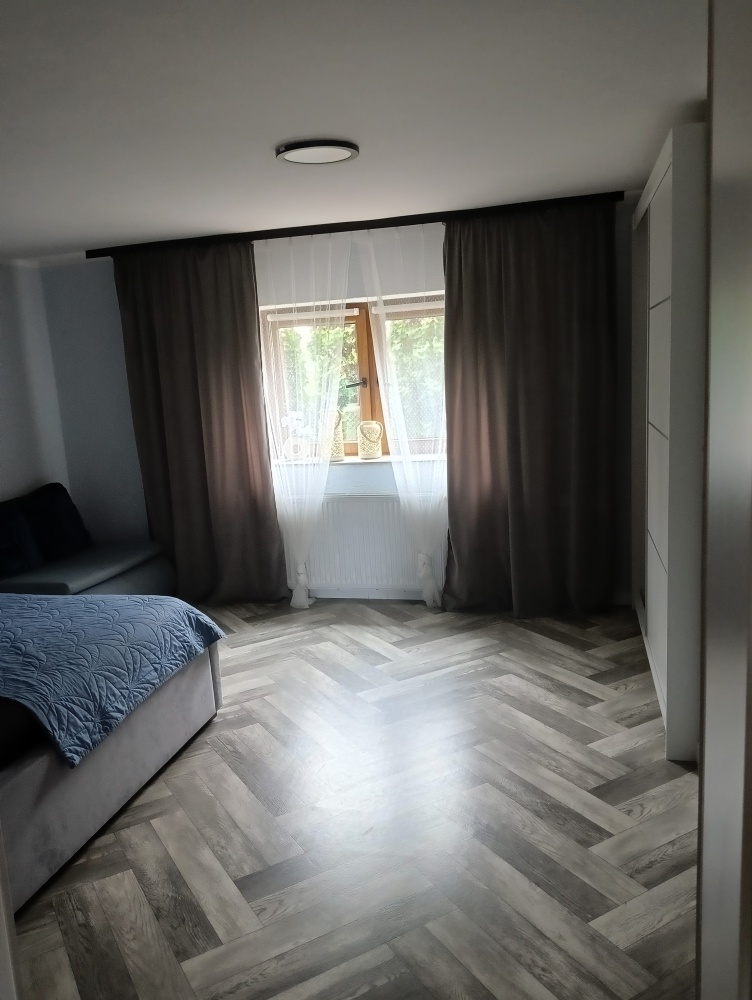 przestronny salon z otwartą kuchnią, przedpokój, łazienka z prysznicem, dwie duże sypialnie .