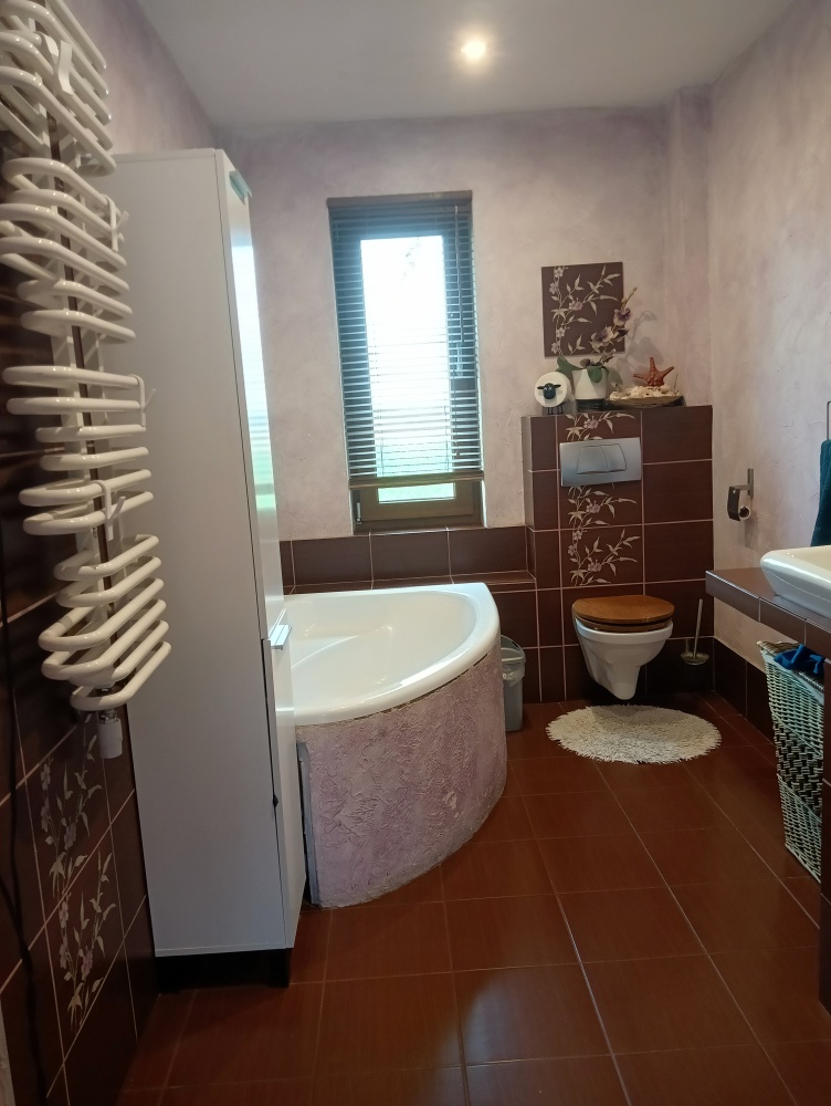 Na piętrze mamy identyczny układ, przy czym w łazience dostępną mamy wannę oraz dwa duże tarasy.