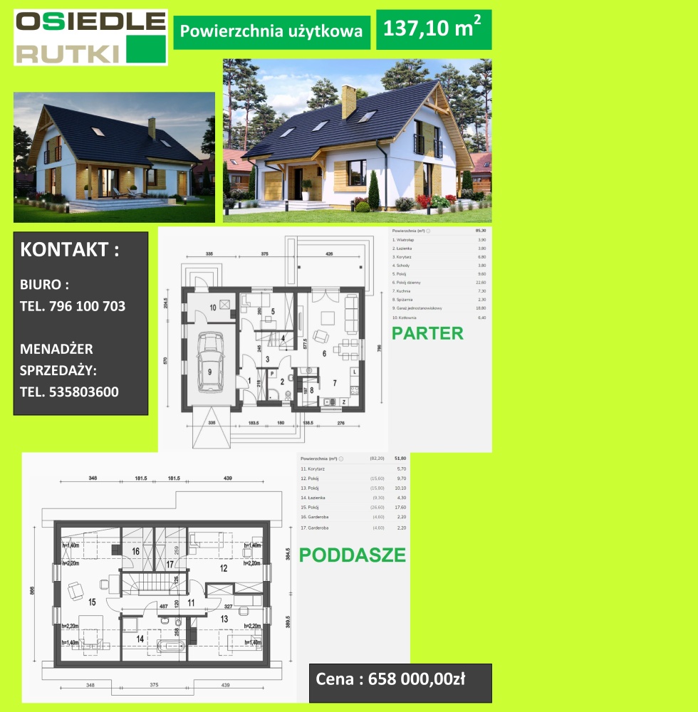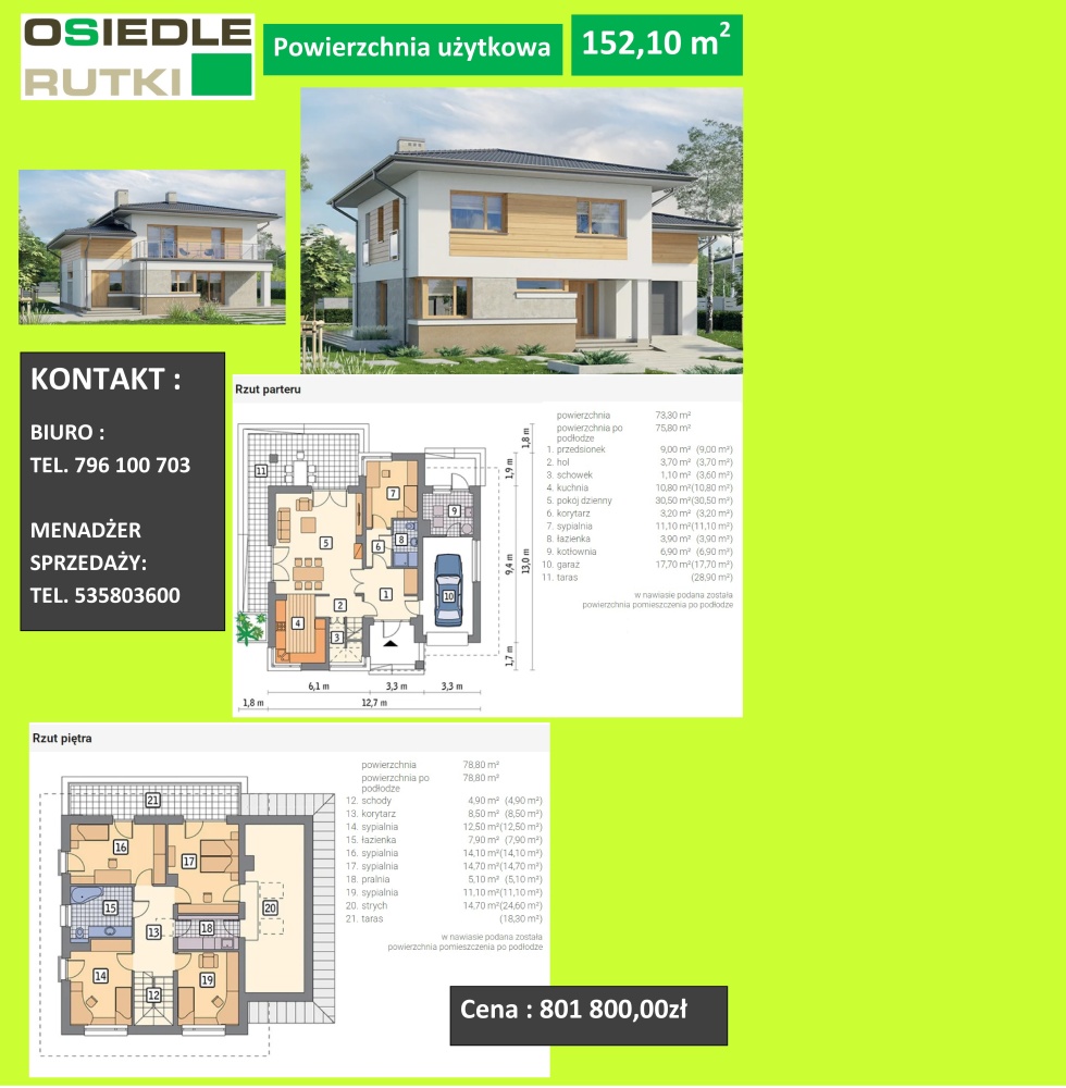 Cena budynku obejmuje wykonane ściany działowe, tynki gipsowe oraz instalacje tylko na parterze, otwory przygotowane do montażu ościeżnic i drzwi wewnętrznych.
