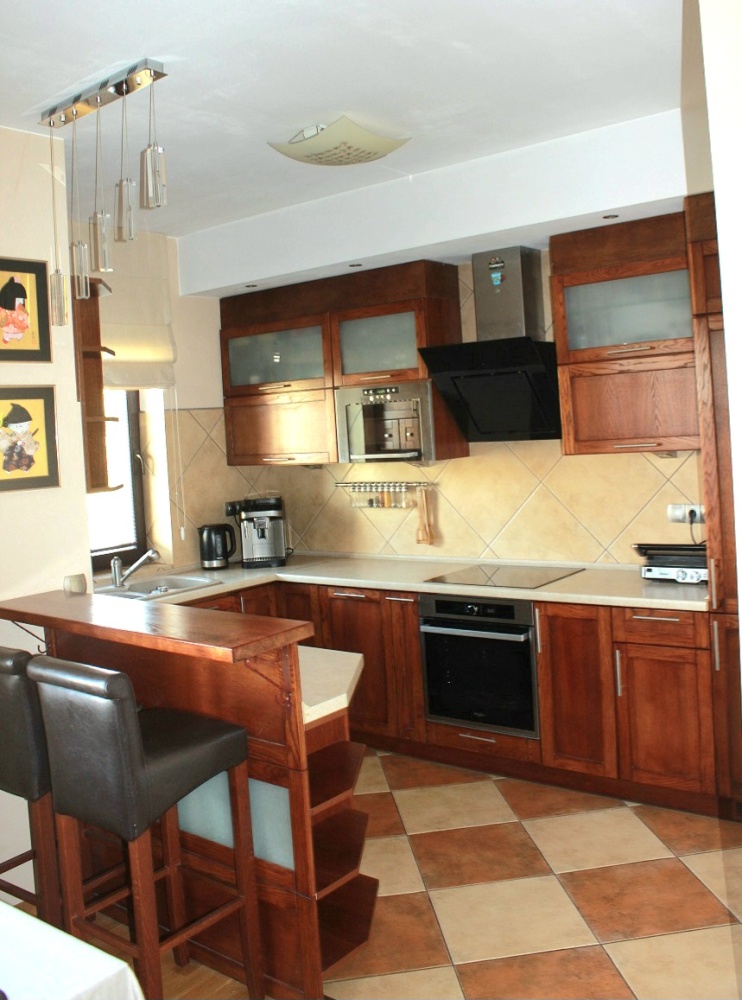 – kuchnia drewniana (dębowe fronty) wykonana przez stolarza, z podgrzewaniem podłogowym