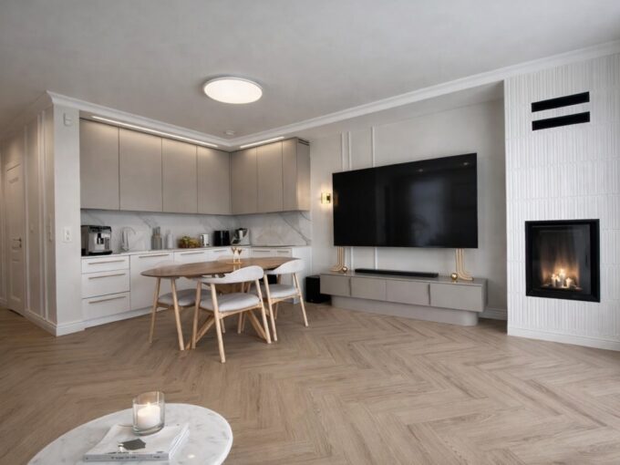 przestronny salon z otwartą kuchnią, przedpokój, łazienka z prysznicem, dwie duże sypialnie .