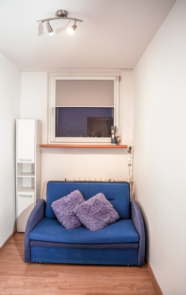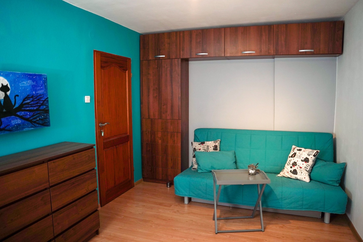 • Rozkładana sofa, stół z krzesłami, regał-biblioteczka, szafa i komoda – idealne miejsce do relaksu lub pracy.