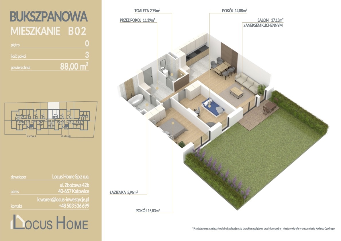 Przedstawiamy ofertę mieszkania 3 – pokojowego o powierzchni 88 m² z OGRÓDKIEM 76 m², zlokalizowanego na parterze budynku, oznaczonego nr B 0.2