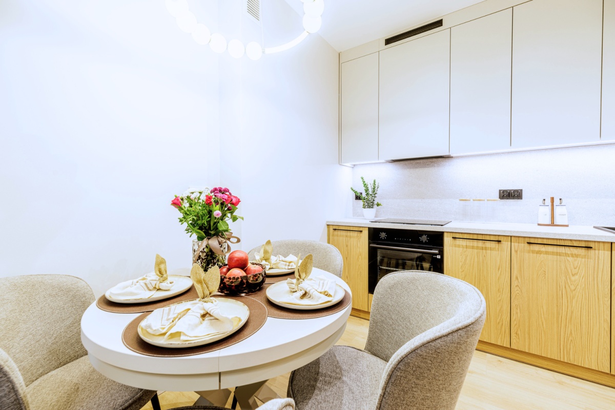 W pełni wyposażona kuchnia to raj dla miłośników gotowania, stworzysz tam ulubione posiłki. AGD nowe z gwarancja : płyta indukcyjna, piekarnik, okap, – wszystko czeka na Ciebie.