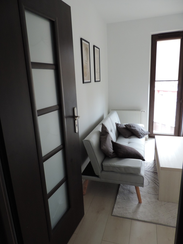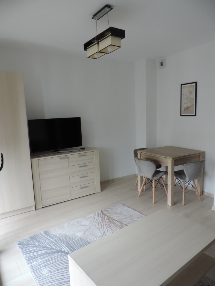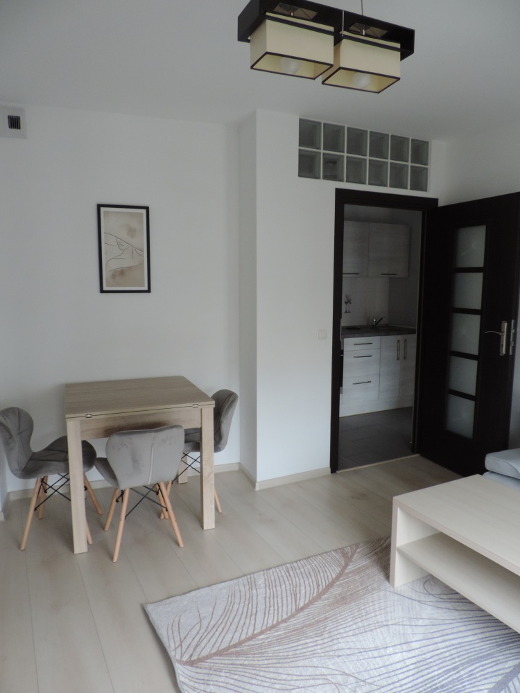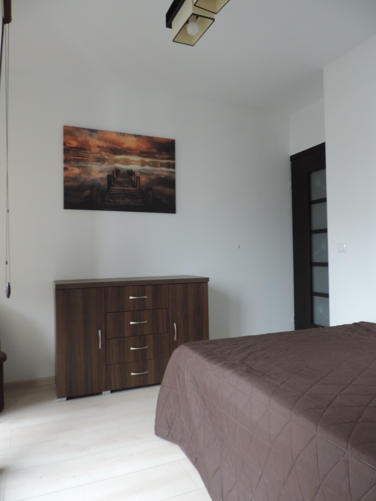 Mieszkanie wykończone materiałami wysokiej jakości, oświetlenie LED. Na wyposażeniu sprzęt AGD (piekarnik, lodówka, kuchenka elektryczna, pralka). W mieszkaniu dużo szaf/przestrzeni do przechowywania. południowa ekspozycja okien.