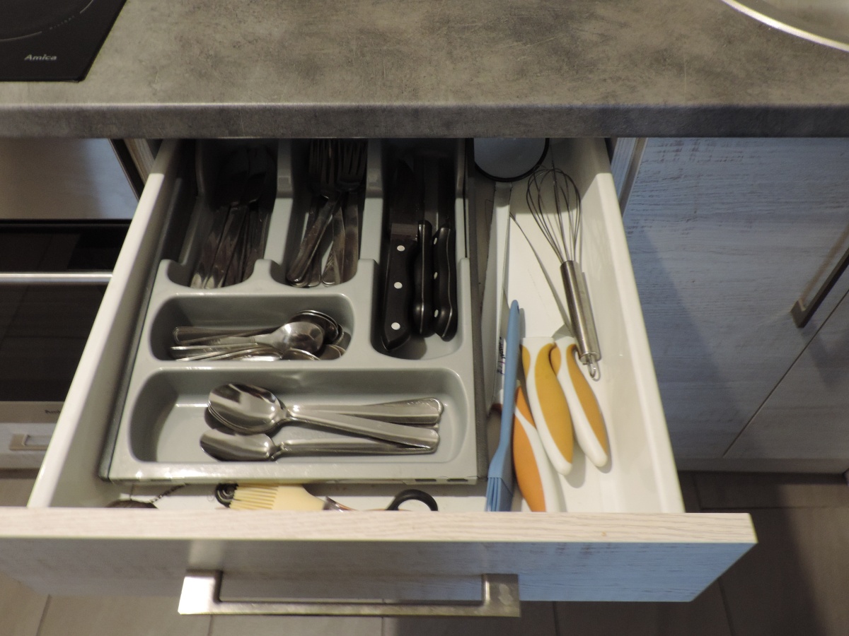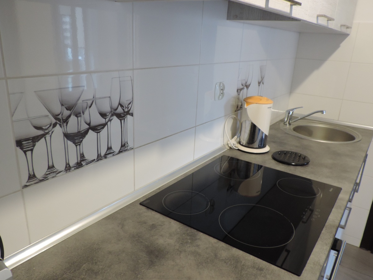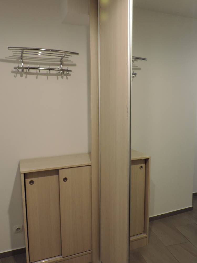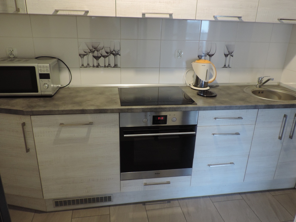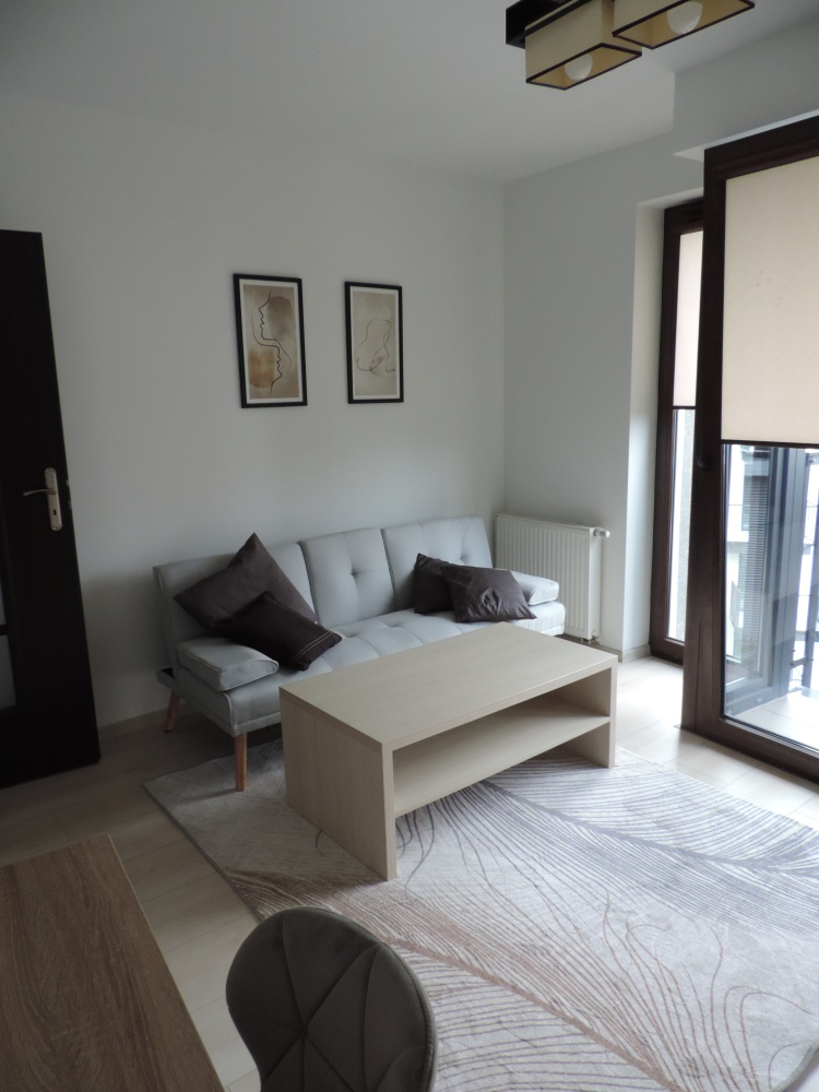 Mieszkanie wyposażone jak na zdjęciach: w kuchni zabudowa meblowa z AGD (zmywarka w zabudowie, piekarnik, płyta indukcyjna, lodówko- zamrażarka, kuchenka mikrofalowa), w sypialni łóżko, w salonie sofa rozkładana oraz szafki, w łazience pralka oraz meble łazienkowe oraz kabina prysznicowa.