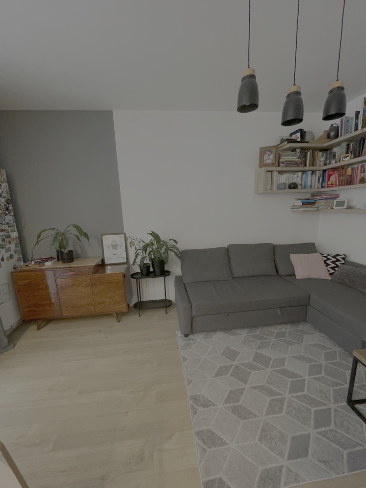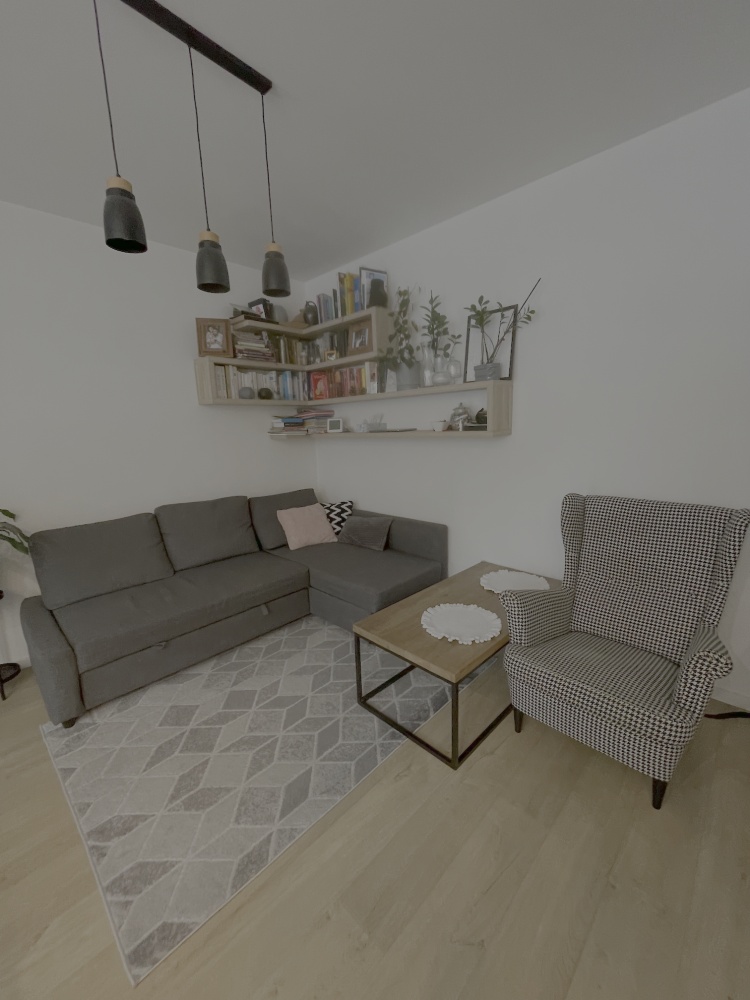– Salon z aneksem kuchennym – przestronny i jasny, z dużymi oknami, które wpuszczają mnóstwo naturalnego światła. Wyposażony w sofę, stolik kawowy, szafkę RTV oraz małą komodę. Dominują jasne kolory – biel, szarość i drewno, które tworzą ciepłą, przytulną atmosferę. Aneks kuchenny w pełni wyposażony w nowoczesny sprzęt AGD: