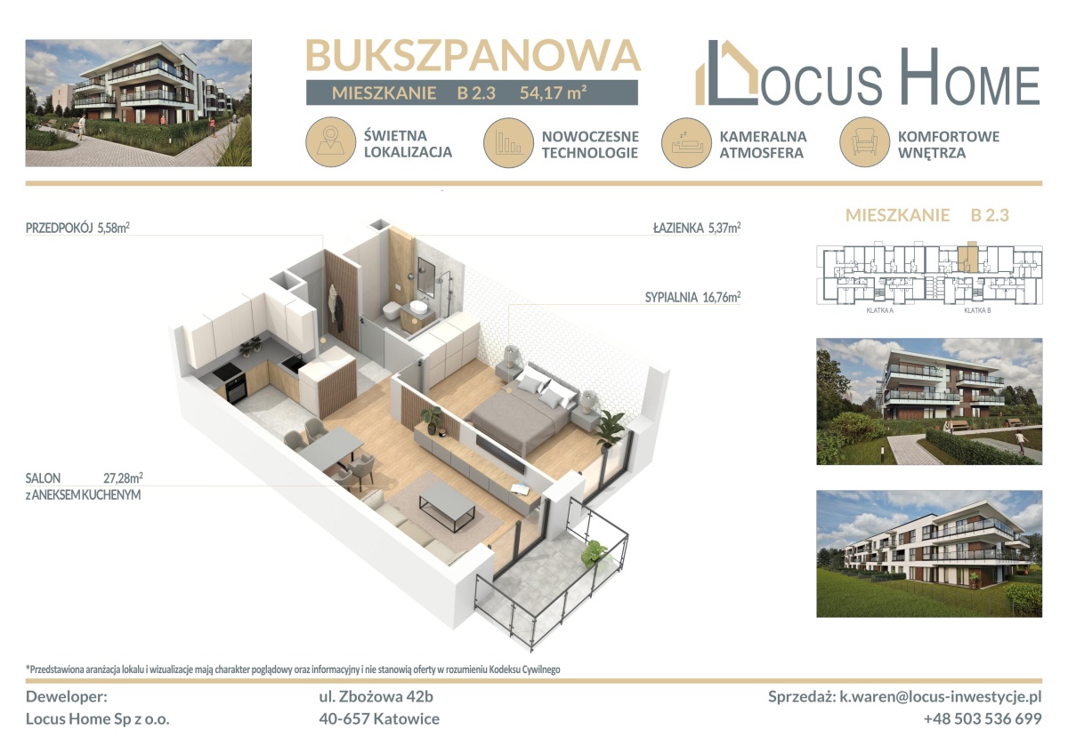 Spółka LOCUS HOME to DEWELOPER który realizuje inwestycje mieszkaniowe na terenie Katowic od wielu lat. NOWA inwestycja na ulicy BUKSZPANOWEJ (obok nr 19) w Piotrowicach to nowoczesny apartamentowiec w doskonałej lokalizacji Katowic.