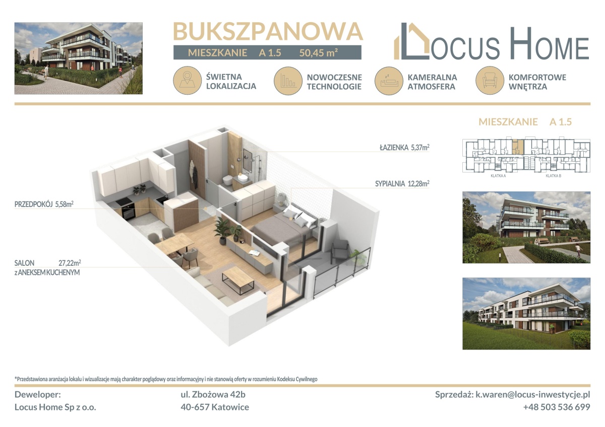 Spółka LOCUS HOME to DEWELOPER który realizuje inwestycje mieszkaniowe na terenie Katowic od wielu lat. NOWA inwestycja na ulicy BUKSZPANOWEJ (obok nr 19) w Piotrowicach to nowoczesny apartamentowiec w doskonałej lokalizacji Katowic.