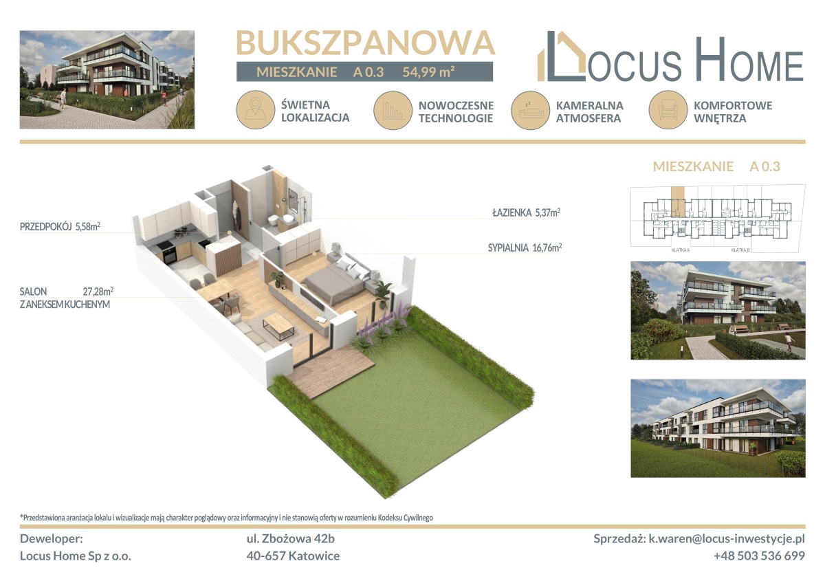 Spółka LOCUS HOME to DEWELOPER który realizuje inwestycje mieszkaniowe na terenie Katowic od wielu lat. NOWA inwestycja na ulicy BUKSZPANOWEJ (obok nr 19) w Piotrowicach to nowoczesny apartamentowiec w doskonałej lokalizacji Katowic.
