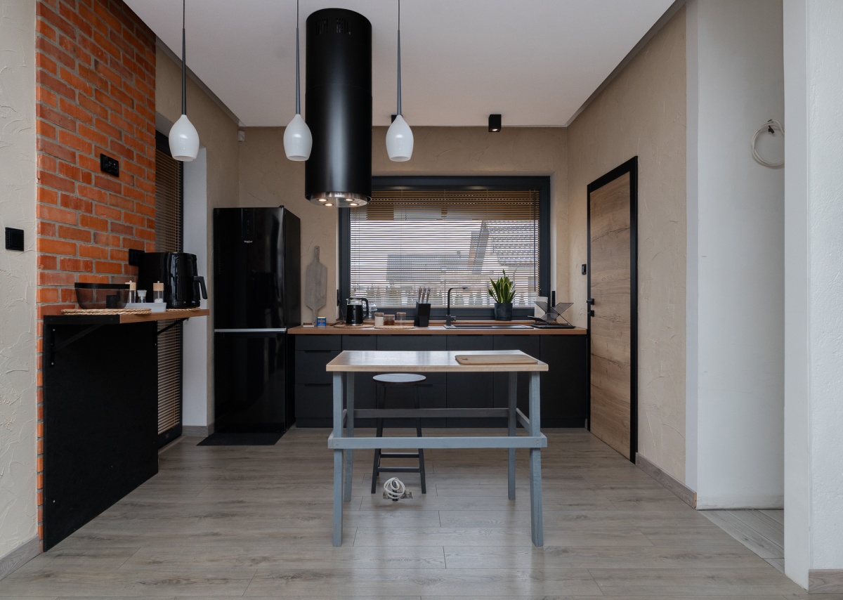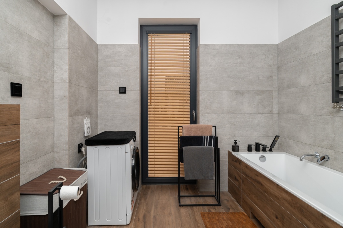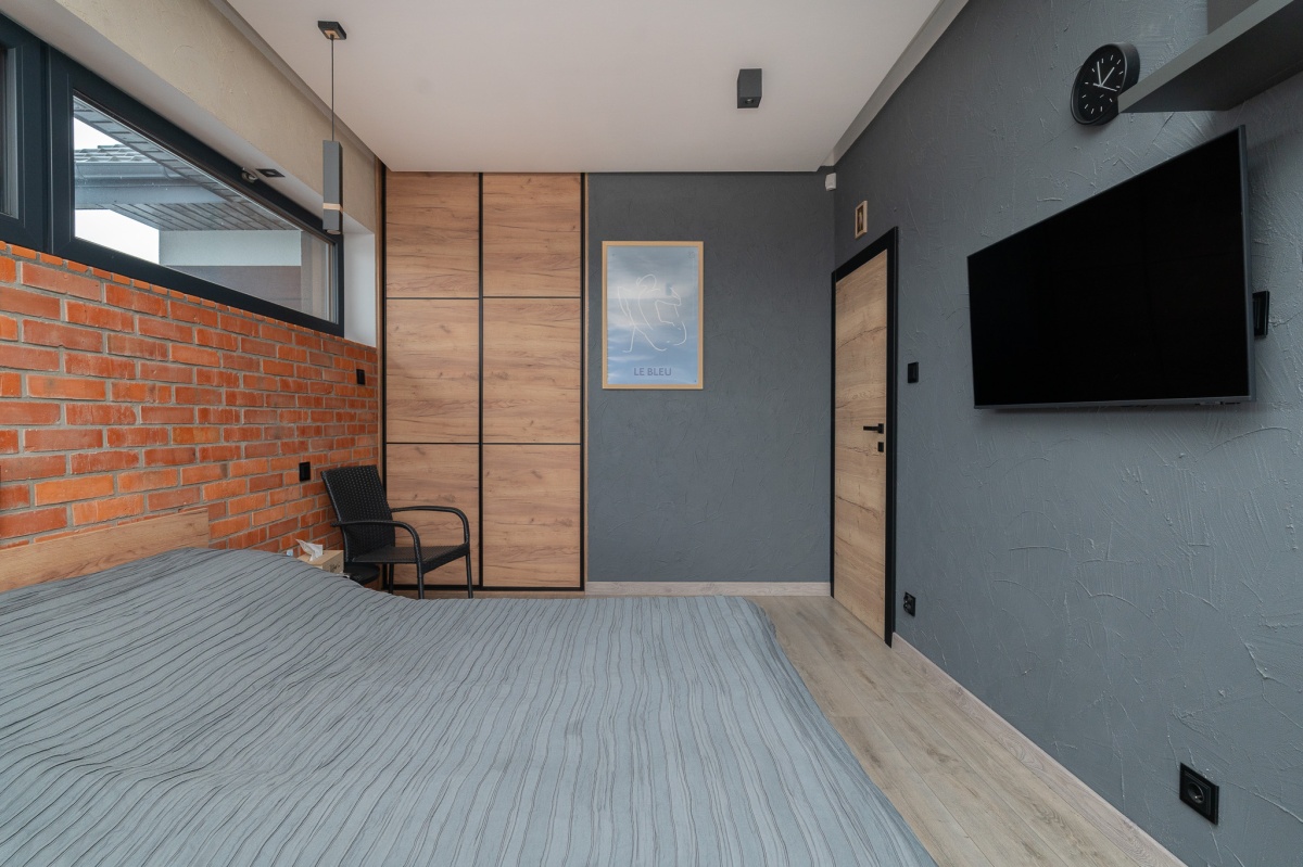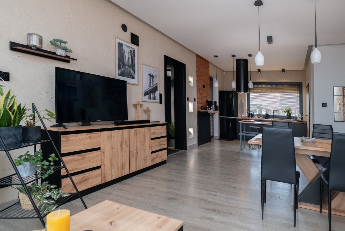 W domu zastosowano bambusowe rolety wewnętrzne, które pięknie współgrają z ceglanymi wstawkami na ścianach, nadając wnętrzu ciepły, przytulny i lekko loftowy klimat. Naturalne materiały tworzą spójną, estetyczną całość i podkreślają nowoczesny charakter nieruchomości.
