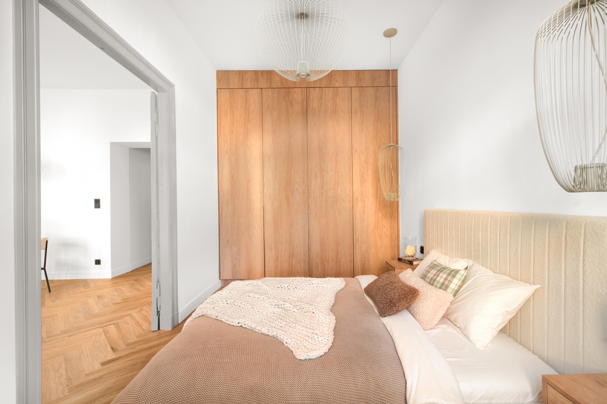 – przestronna sypialnia, do której prowadzą odrestaurowane, kamieniczne dwuskrzydłowe drzwi w kolorze szarym,