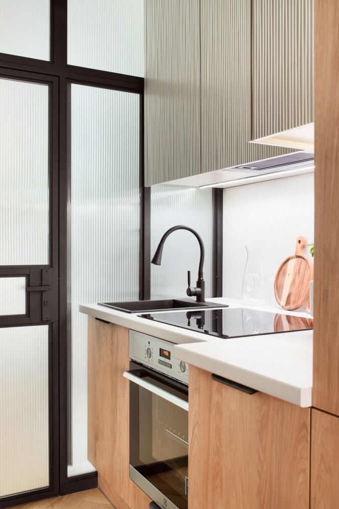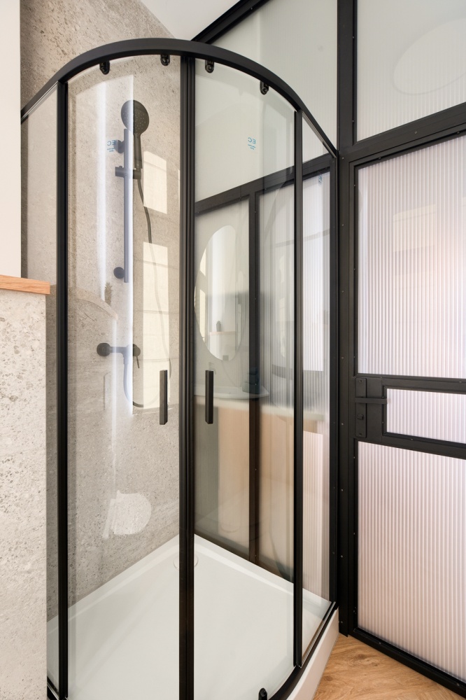 – do łazienki prowadzą drzwi osadzone na metalowo-szklanej ścianie wykonanej według naszego indywidualnego projektu na zamówienie. Szkło matowe, dwuwarstwowe, ryflowane,