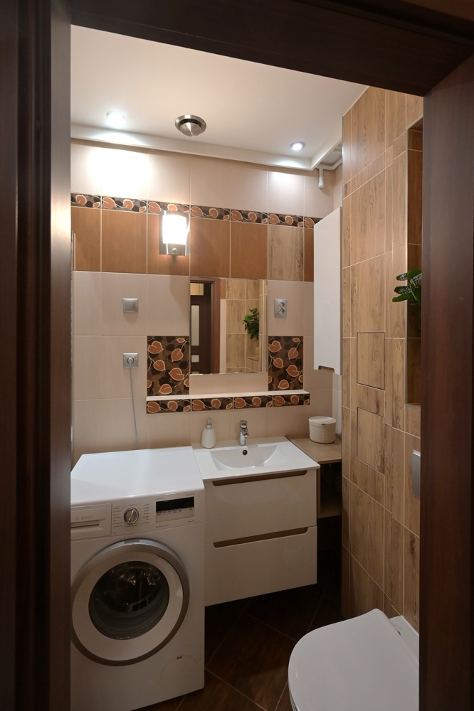 Lokal jest zadbany, urządzony w stonowanej kolorystyce, w pełni umeblowany i wyposażony w niezbędne sprzęty AGD: zmywarkę, piekarnik, kuchenkę oraz pralkę.