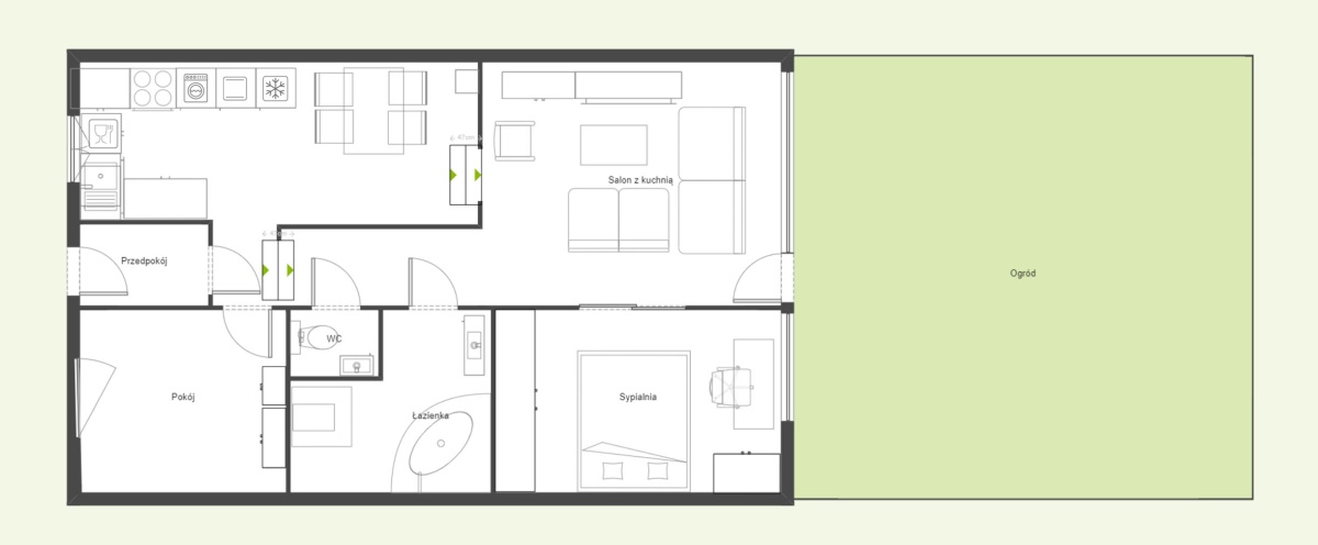 Mieszkanie składa się z otwartego salonu z aneksem kuchennym oraz wyjściem do ogrodu, 2 sypialni, łazienki wyposażonej w wannę oraz prysznic, osobnego WC, wiatrołapu.