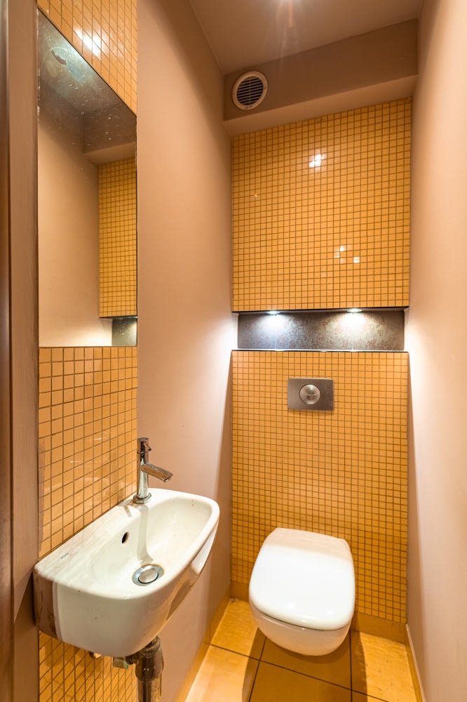 W łazience znajduje się umywalka, oraz kabina prysznicowa. Toaleta znajduje się w oddzielnym pomieszczeniu. W łazience i w toalecie na ścianach i podłodze położone są płytki ceramiczne.