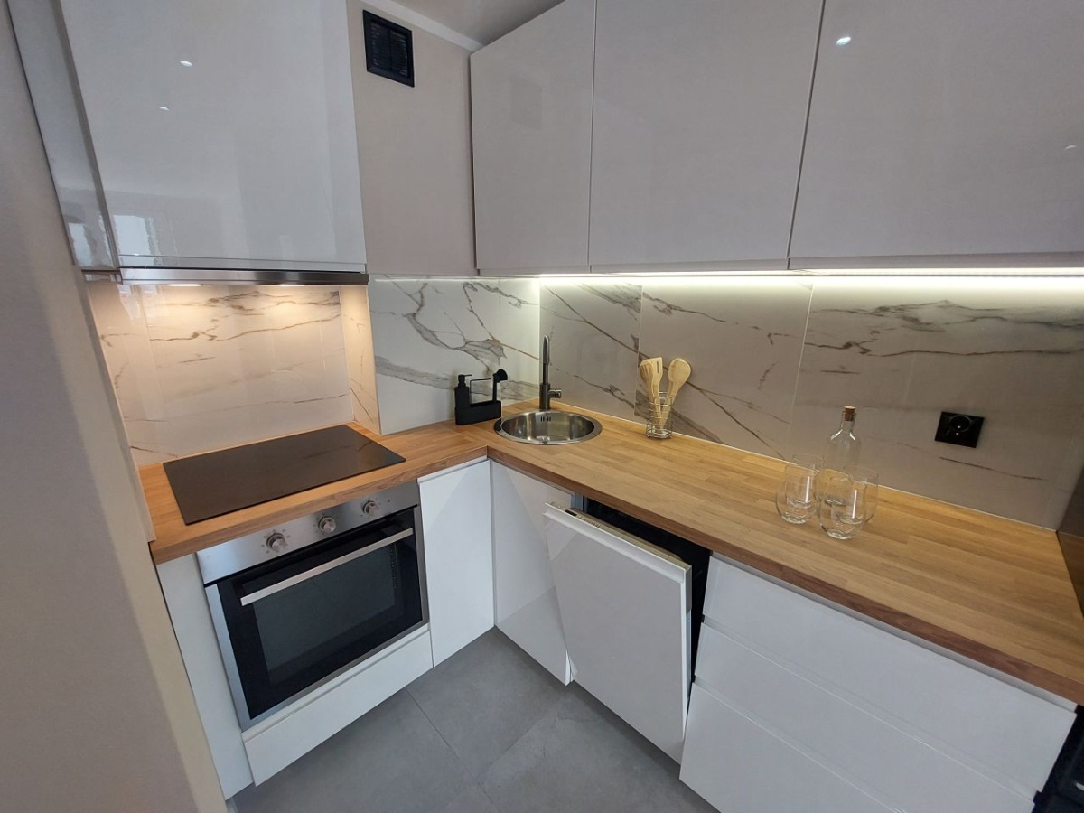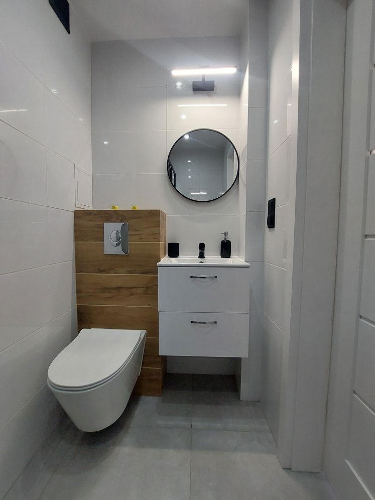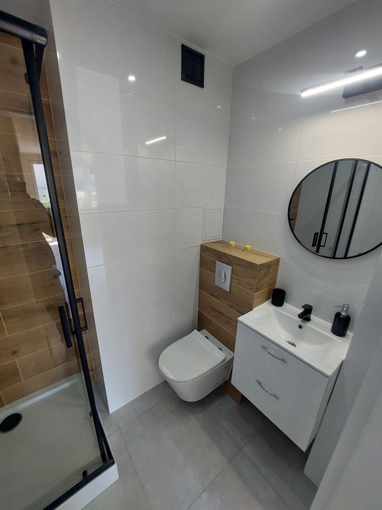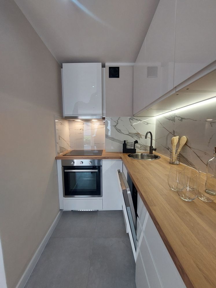 – nowa zabudowa kuchni wraz ze sprzętem AGD – piekarnik, zmywarka, płyta elektryczna/gazowa, okap, lodówka (fronty biały połysk, blat w odcieniach drewna – do ukończenia remontu istnieje możliwość wyboru),