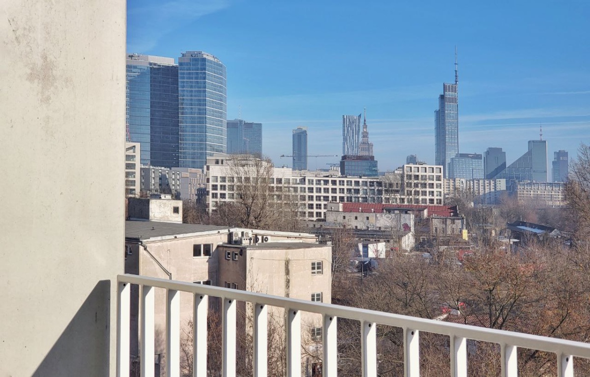 Mieszkanie znajduje się na 3. piętrze i wyróżnia się przemyślanym, funkcjonalnym rozkładem — salon z aneksem kuchennym, duża sypiania z miejscem na garderobę, druga sypiania/gabinet, łazienka + dodatkowo balkon. Z mieszkania widok na panoramę centrum Warszawy i biurowców przy Rondzie Daszyńskiego.