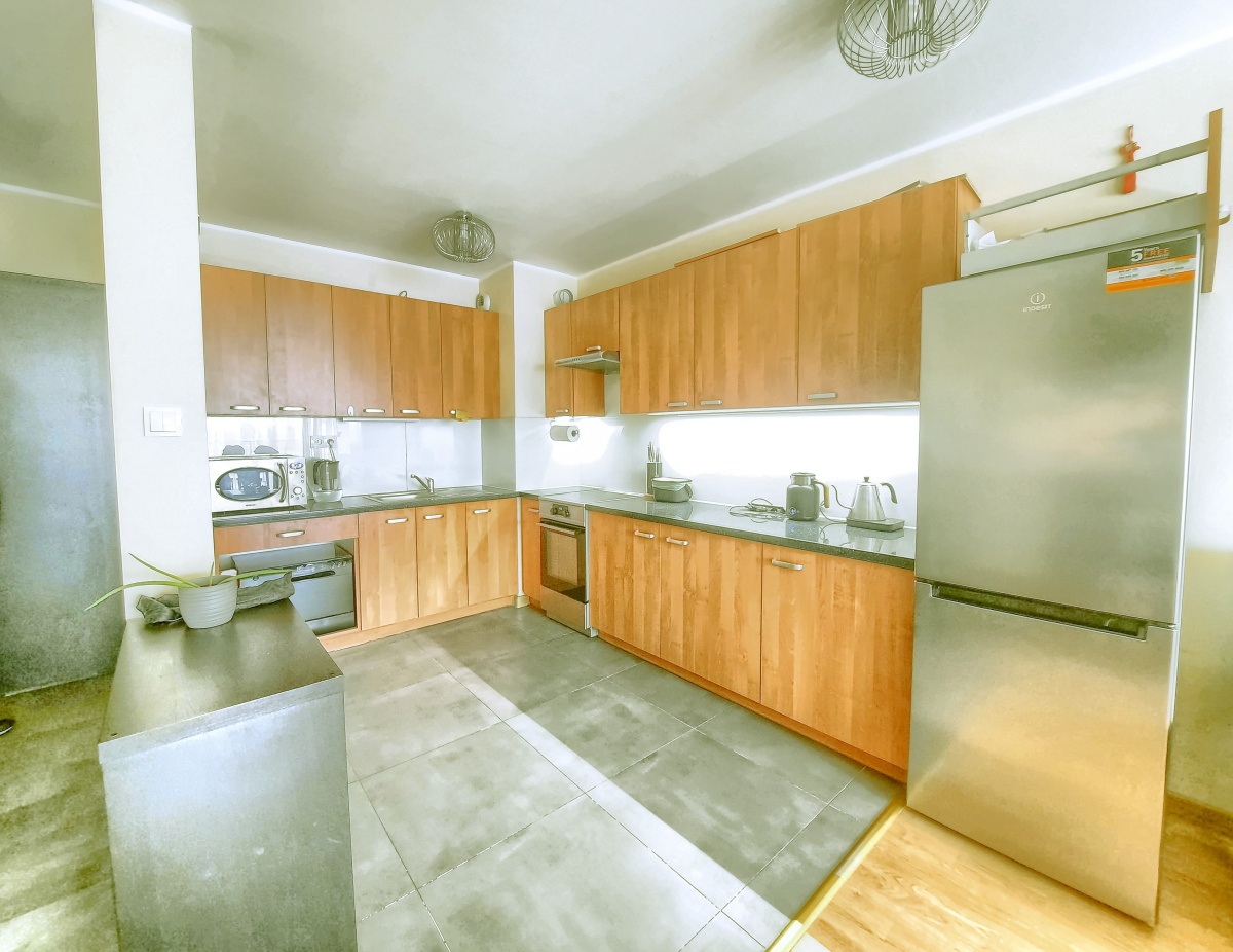 aneks kuchenny: lodówka, kuchenka z piekarnikiem, zmywarka, okap z wyciągiem, meble w zabudowie wysokiej jakości;
