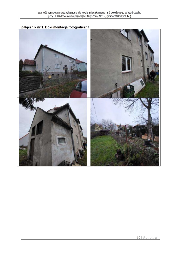 Przedmiotowy lokal nr 2 jest jednym z trzech lokali znajdujących się w budynku mieszkalnym kilkulokalowym przy ul. Uzdrowiskowej 3 w Wałbrzychu. Położony jest on na parterze – 1 kondygnacji budynku. Zgodnie z zapisami w księdze wieczystej lokal składa się z 2 pokoi i kuchni. W wyniku modernizacji w dobudówce wydzielono łazienkę ( powierzchnia dobudówki nie jest wliczona w powierzchnie użytkową lokalu).. Ponadto w lokalu znajduje się jeszcze przedpokój i wc. Lokal nie w pełni rozkładowy, z pomieszczeniem przechodnim z dobrym doświetleniem światłem dziennym. Z jednego pokoju przechodzi się do drugiego pokoju. Do lokalu przynależy ponadto piwnica o powierzchni 6,50 m2 (nie ujęta w księdze wieczystej). W lokalu centralne ogrzewanie. Piec na węgiel zamontowany w piwnicy. Lokal nie jest podłączony do miejskiej sieci gazowej, mimo iż w budynku jest gaz. Powierzchnia użytkowa lokalu ( zgodnie z księgą wieczystą): 44,00 m2 Powierzchnia użytkowa lokalu na podstawie pomiarów z wizji lokalnej: 48,21 m2 Różnica powierzchni użytkowej ujawnionej w księdze wieczystej i powierzchni użytkowej pomierzonej z natury o wartości 4,21 m2, wynika z adaptowania pomieszczenia gospodarczego zlokalizowanego w dobudówce do budynku mieszkalnego na cele mieszkalne – łazienkę. Nie zostało to formalnie zalegalizowane i ta powierzchnia łazienki nie została ujęta w powierzchni użytkowej lokalu. Standard wykończenia lokalu – niski.