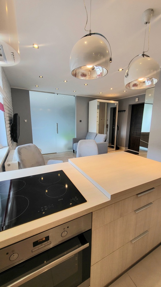 • Kuchnia z Wyspą: Nowoczesna, w pełni wyposażona w wysokiej klasy sprzęt AGD Electrolux (płyta indukcyjna, piekarnik, zmywarka, lodówka w zabudowie). Solidne szuflady Blum i praktyczna wyspa z nowoczesnym pochłaniaczem z filtrem węglowym sprawiają, że gotowanie staje się przyjemnością, a miejsce do spożywania posiłków jest zawsze pod ręką.
