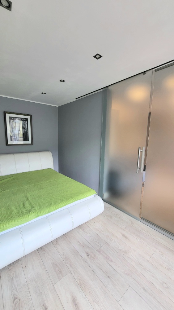 • Sypialnia z Wyjściem na Taras: Twoja prywatna przestrzeń do snu i relaksu. Znajdziesz tu superwygodne, duże łóżko (180×200), gwarantujące doskonały sen. Duże szklane, przesuwne drzwi , drzwi balkonowe prowadzą bezpośrednio na taras – wyobraź sobie poranną kawę czy wieczorny odpoczynek na świeżym powietrzu