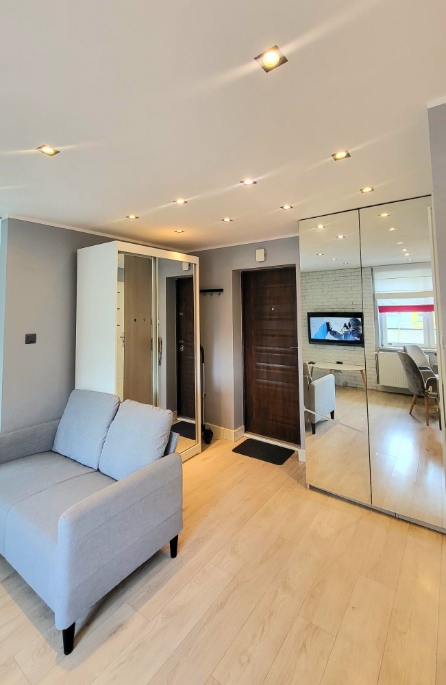 • Salon: Przestronna strefa relaksu – idealne miejsce na odpoczynek po długim dniu,na spotkanie z przyjaciółmi czy spokojny wieczór z książką. W pełni wyposażony: wygodna nowa sofa, nowy stolik kawowy, 2 krzesła, TV DVBT i dwie pojemne szafy z lustrem.