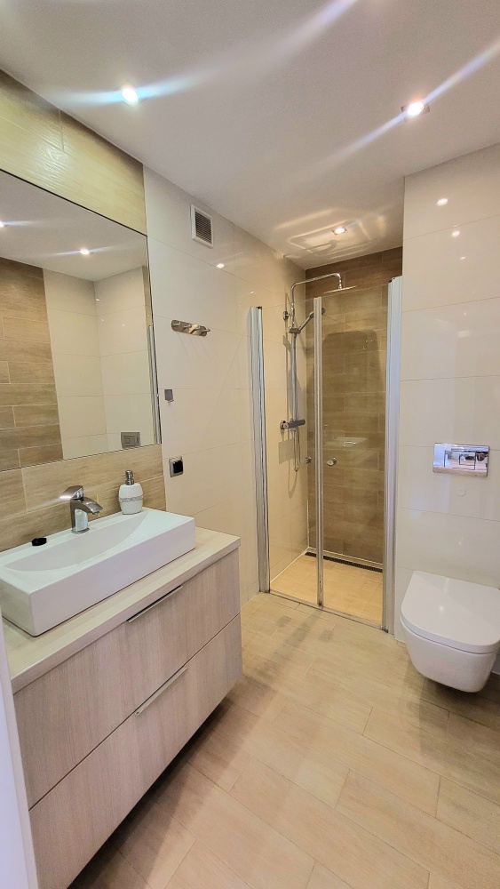 • Łazienka: Funkcjonalna i estetyczna, wyposażona w WC (Koło), kabinę prysznicową z deszczownicą i baterią termostatyczną , umywalkę, szafkę i pralkę.