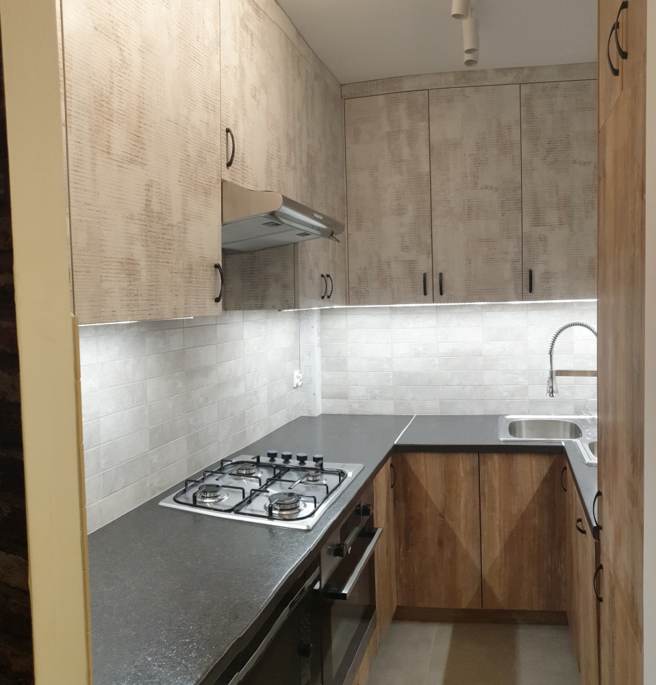 Kuchnia z niezbędnym sprzętem AGD w zwartej, przyjaznej zabudowie, z wielkim blatem roboczym. Duża lodówka i zamrażarka, mikrofala, zmywarka, kuchnia gazowa i elektryczny piekarnik. Duży zlew z ociekaczem. Dużo szafek. Kulinarnie jest gdzie poszaleć. Oświetlenie LED, górne i podszawkowe.