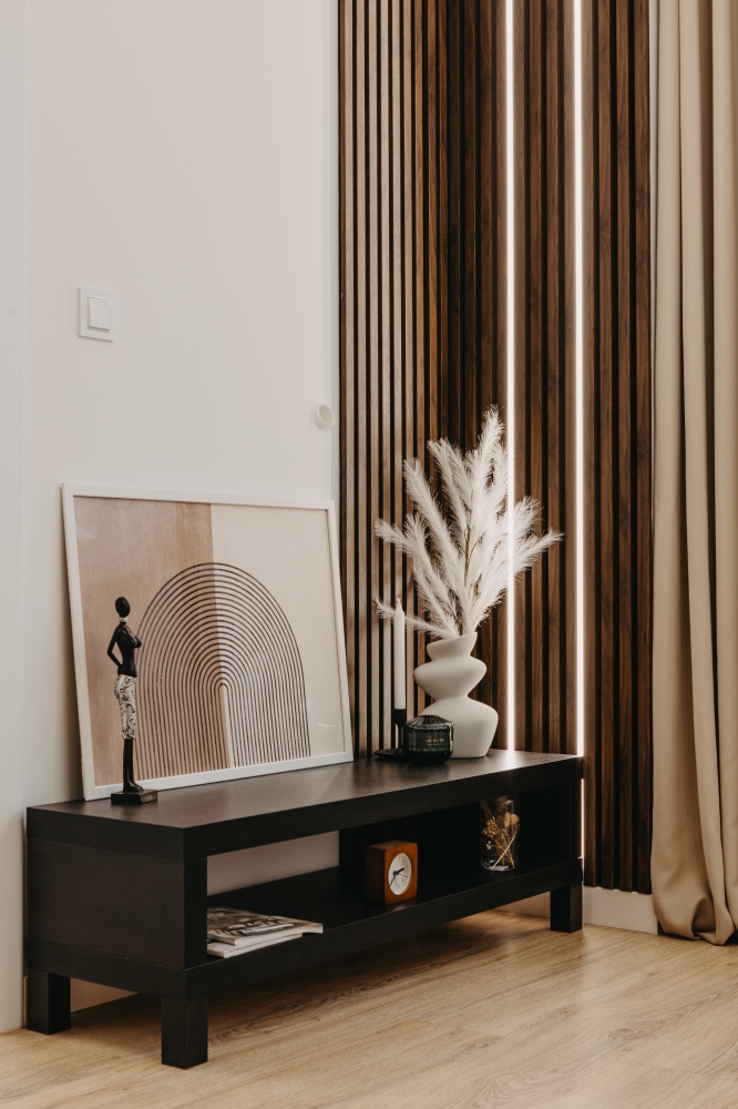 Remont obejmował: wymianę instalacji elektrycznych i wod.-kan., gładzie gipsowe i nowe panele, wymianę stolarki drzwiowej wewnętrznej, nowoczesną łazienkę z pełnym wyposażeniem. Wszystkie materiały wykorzystane w trakcie remontu są wysokiej jakości, a aranżacja została wykonana z dbałością o detale.