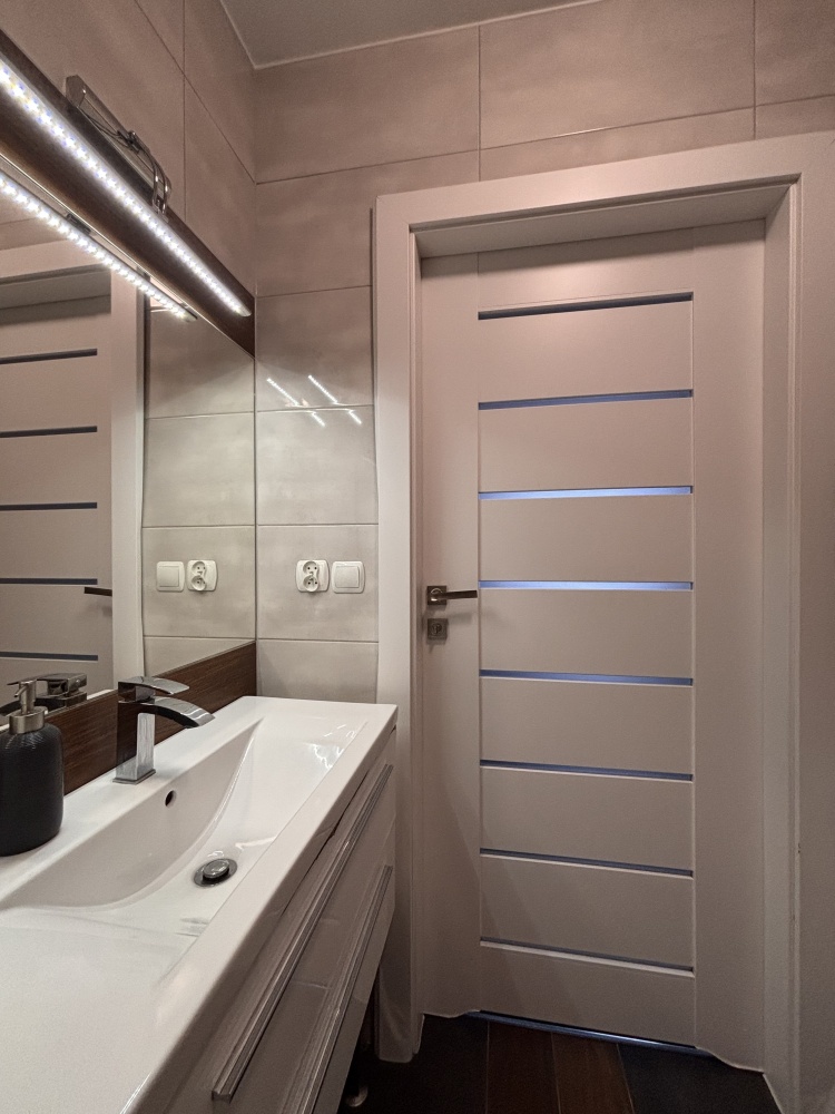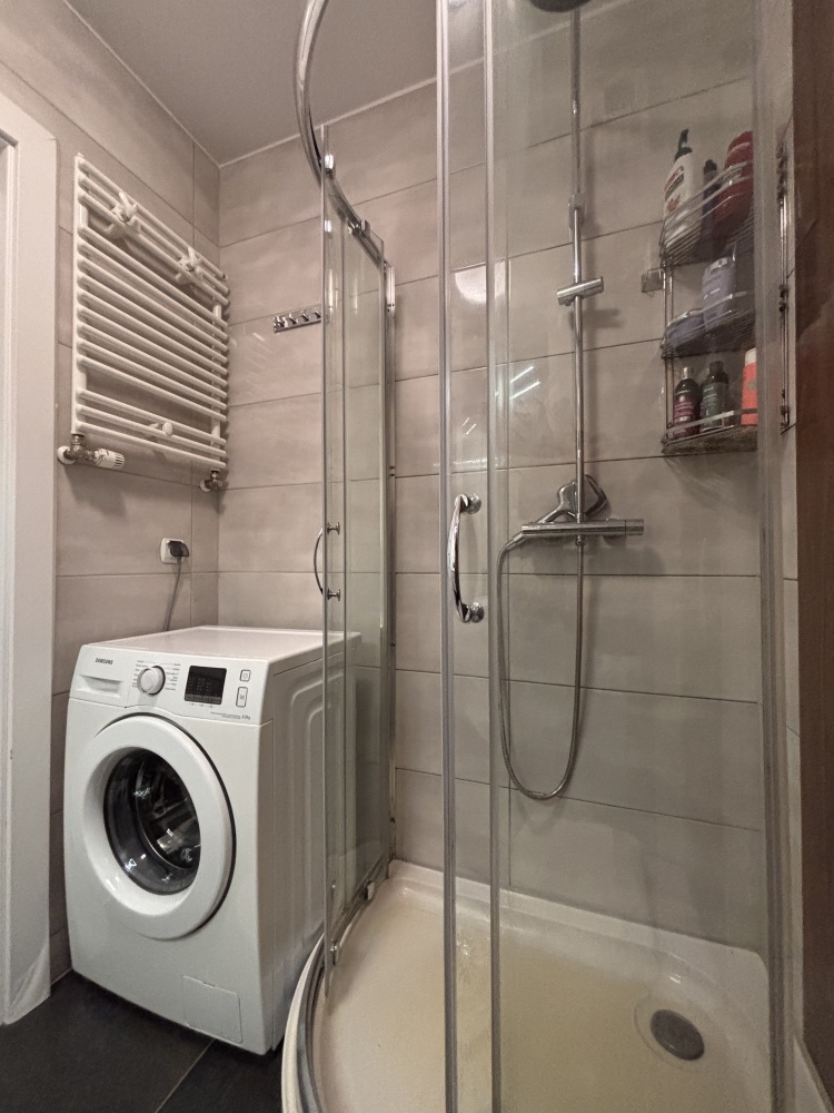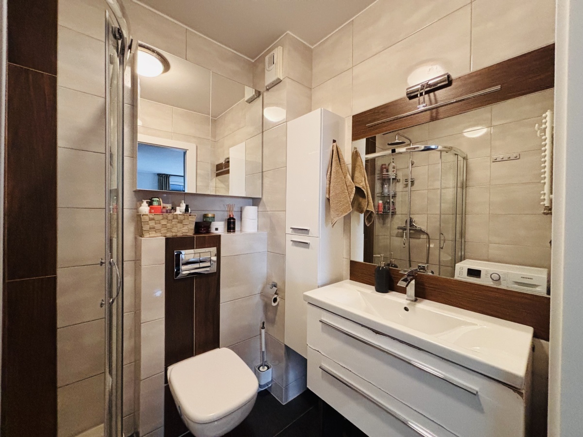 Mieszkanie zadbane i spójnie urządzone. Aneks kuchenny w zabudowie, część dzienna z miejscem na stół i strefę wypoczynku. Łazienka z kabiną prysznicową, pralką oraz zabudową do przechowywania.
