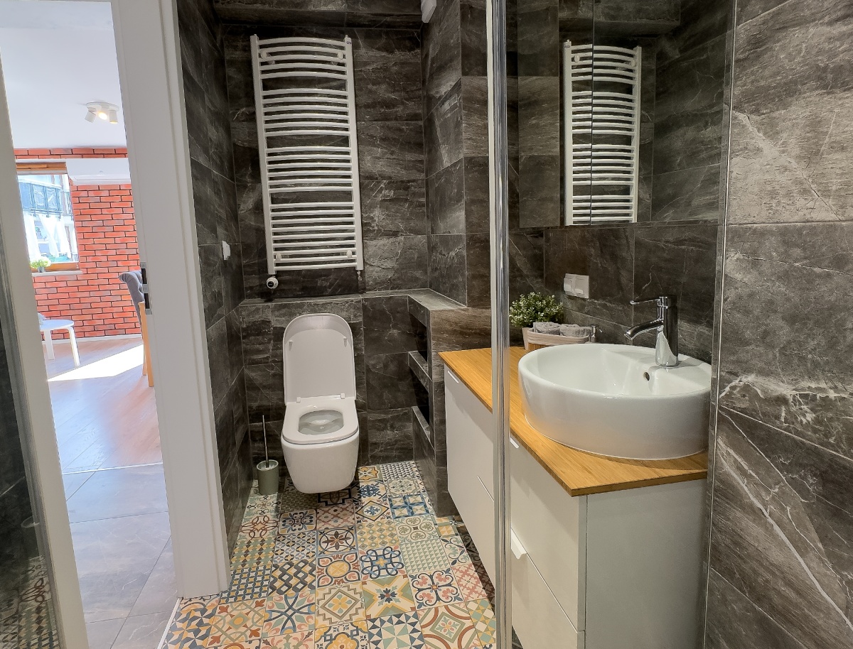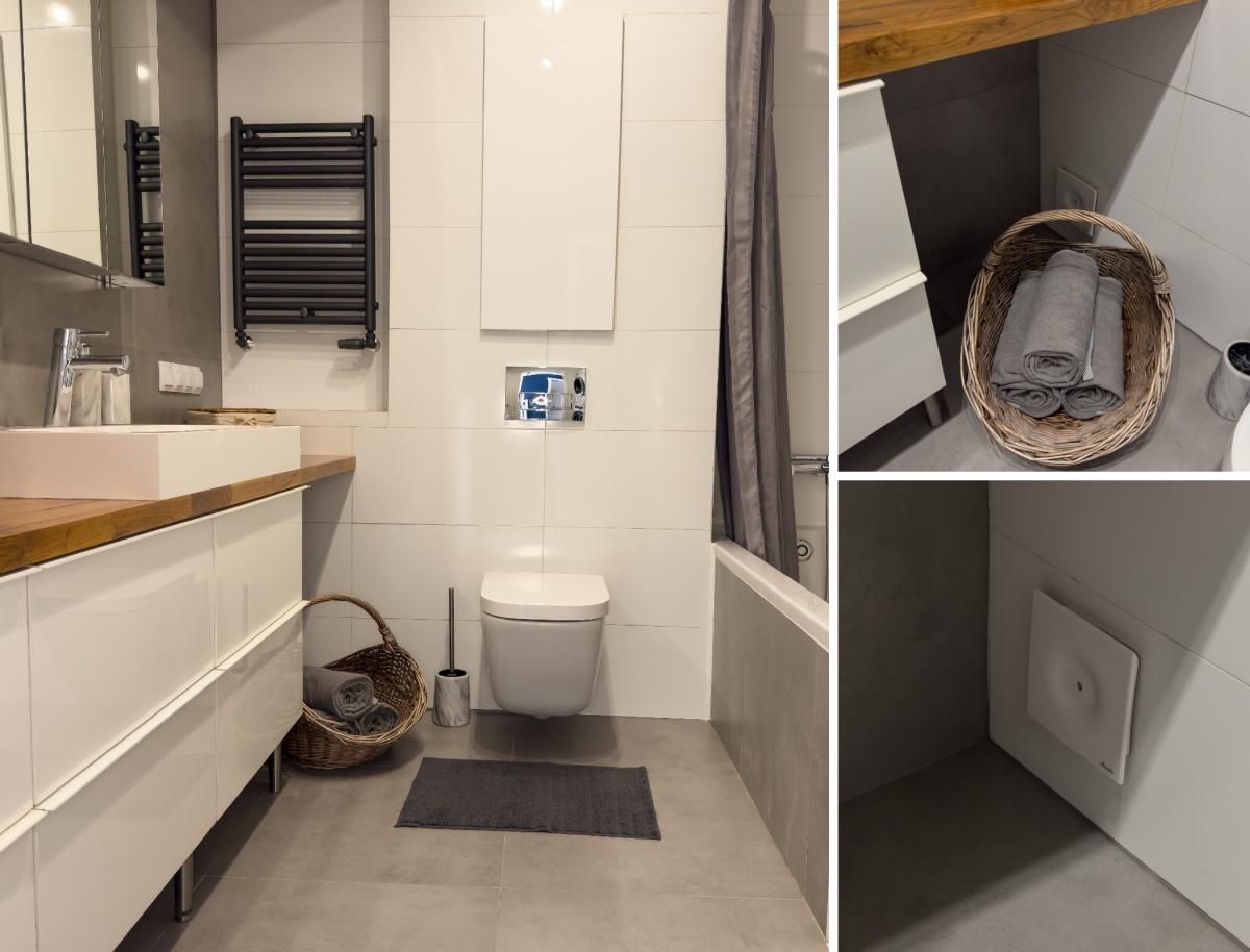 Wyjątkowym atutem mieszkania jest posiadanie dwóch w pełni wyposażonych łazienek. Pierwsza, na parterze, to praktyczna łazienka z nowoczesnym prysznicem, idealna do codziennych porannych rutyn. Druga, na piętrze, to przestronna łazienka z wanną, gdzie można się zrelaksować po długim dniu. Takie rozwiązanie eliminuje kolejki do łazienki w rodzinie, zapewnia prywatność i znacznie podnosi komfort codziennego użytkowania mieszkania.