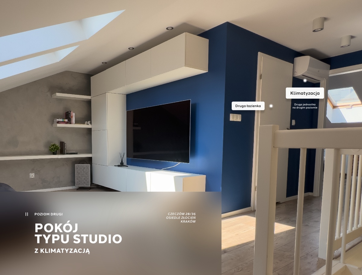 Mieszkanie wyposażone jest w nowoczesną klimatyzację na obydwu piętrach, zapewniającą doskonałe warunki mieszkaniowe przez cały rok. Wydajny system klimatyzacyjny pozwala na skuteczne schłodzenie mieszkania w gorące letnie dni oraz stanowi doskonałe uzupełnienie ogrzewania w okresie zimowym. To rozwiązanie gwarantuje komfort termiczny niezależnie od pory roku i warunków atmosferycznych.