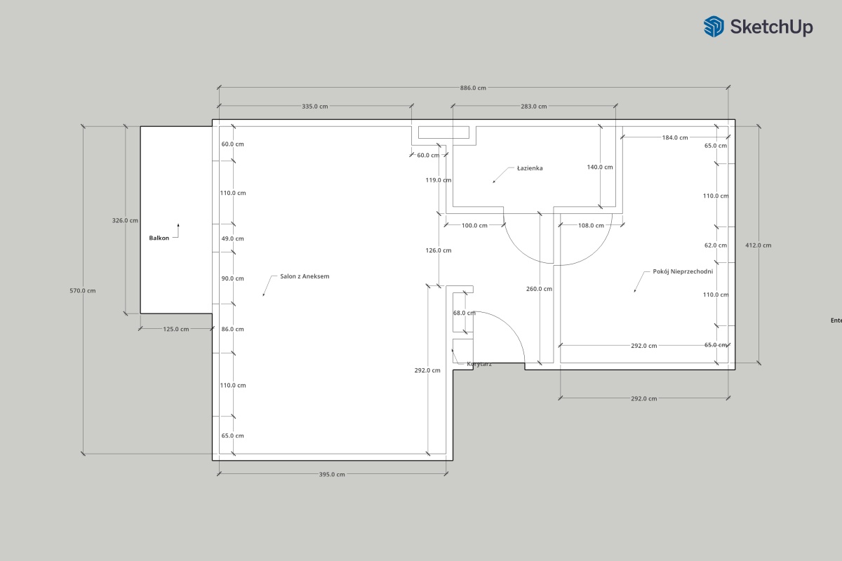 Poziom pierwszy: przestronny salon z aneksem kuchennym, łazienka z prysznicem, sypialnia, wyjście na balkon, wiatrołap