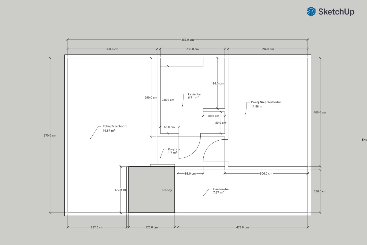 Poziom drugi: pokój przechodni, duża łazienka z wanną, garderoba, główna sypialnia
